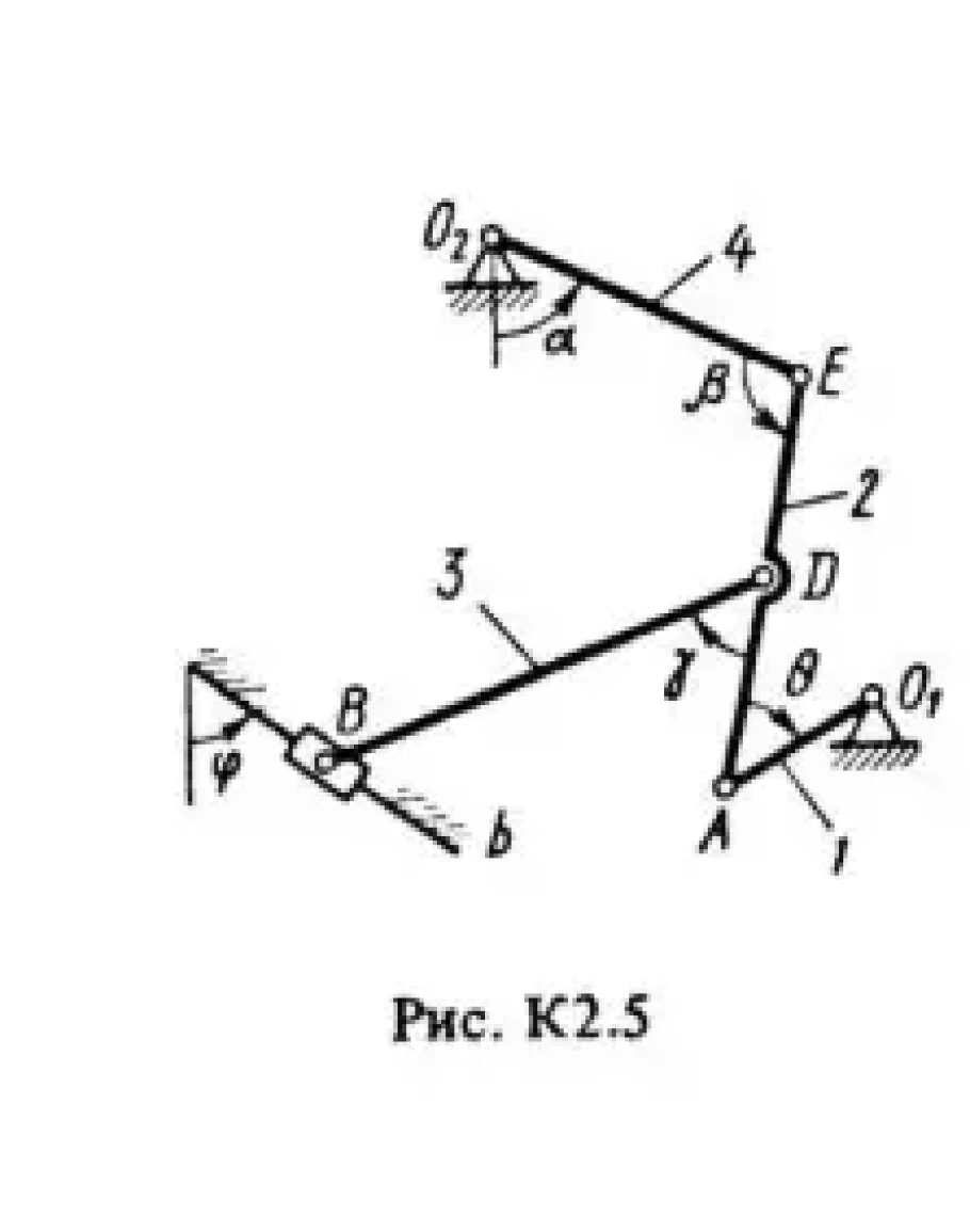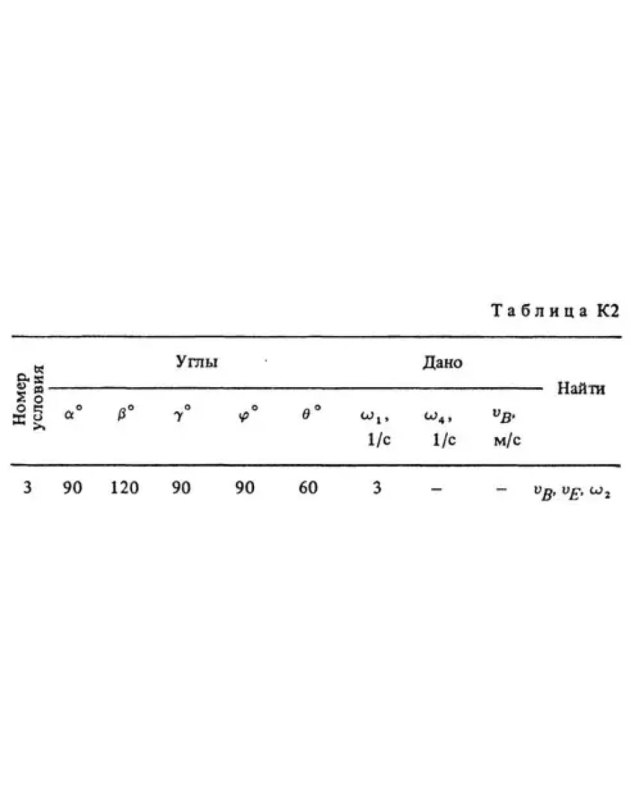 Плоский механизм состоит из стержней 1 – 4 и ползуна B, соединенных друг с другом и с неподвижными опорами O1 и O2 шарнирами (рис. К2.0-К2.9). Длины стержней: l1 = 0,4 м, l2 = 1,2 м, l3 = 1,4 м, l4 = 0,8 м. Положение механизма определяется углами α, β, γ, φ, θ, которые вместе с другими величинами заданы в табл. К2. Точка D на всех рисунках и точка К на рис. К2.7-К2.9 в середине соответствующего стержня. Определить величины, указанные в таблице в столбце «Найти». Найти также ускорение aA точки А стержня 1, если стержень 1 имеет в данный момент времени угловое ускорение ε1 = 10 с-2 Дуговые стрелки на рисунках показывают, как при построении чертежа должны откладываться соответствующие углы, т.е. по ходу или против хода часовой стрелки (например, угол γ на рис. 1 следует отложить от стержня DE против хода часовой стрелки, а на рис. 2 – от стержня AE по ходу часовой стрелки). Построение чертежа начинать со стержня, направление которого определяется углом α; ползун В и его направляющие для большей наглядности изобразить, как в примере К2 (см. рис. К2). Заданную угловую скорость считать направленной против хода часовой стрелки, а заданную скорость vB – от точки В к b.