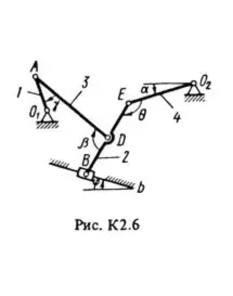 Плоский механизм состоит из стержней 1 – 4 и ползуна B, соединенных друг с другом и с неподвижными опорами O1 и O2 шарнирами (рис. К2.0-К2.9). Длины стержней: l1 = 0,4 м, l2 = 1,2 м, l3 = 1,4 м, l4 = 0,8 м. Положение механизма определяется углами α, β, γ, φ, θ, которые вместе с другими величинами заданы в табл. К2. Точка D на всех рисунках и точка К на рис. К2.7-К2.9 в середине соответствующего стержня. Определить величины, указанные в таблице в столбце «Найти». Найти также ускорение aA точки А стержня 1, если стержень 1 имеет в данный момент времени угловое ускорение ε1 = 10 с-2 Дуговые стрелки на рисунках показывают, как при построении чертежа должны откладываться соответствующие углы, т.е. по ходу или против хода часовой стрелки (например, угол γ на рис. 1 следует отложить от стержня DE против хода часовой стрелки, а на рис. 2 – от стержня AE по ходу часовой стрелки). Построение чертежа начинать со стержня, направление которого определяется углом α; ползун В и его направляющие для большей наглядности изобразить, как в примере К2 (см. рис. К2). Заданную угловую скорость считать направленной против хода часовой стрелки, а заданную скорость vB – от точки В к b.