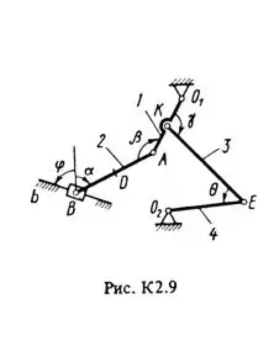 Плоский механизм состоит из стержней 1 – 4 и ползуна B, соединенных друг с другом и с неподвижными опорами O1 и O2 шарнирами (рис. К2.0-К2.9). Длины стержней: l1 = 0,4 м, l2 = 1,2 м, l3 = 1,4 м, l4 = 0,8 м. Положение механизма определяется углами α, β, γ, φ, θ, которые вместе с другими величинами заданы в табл. К2. Точка D на всех рисунках и точка К на рис. К2.7-К2.9 в середине соответствующего стержня. Определить величины, указанные в таблице в столбце «Найти». Найти также ускорение aA точки А стержня 1, если стержень 1 имеет в данный момент времени угловое ускорение ε1 = 10 с-2 Дуговые стрелки на рисунках показывают, как при построении чертежа должны откладываться соответствующие углы, т.е. по ходу или против хода часовой стрелки (например, угол γ на рис. 1 следует отложить от стержня DE против хода часовой стрелки, а на рис. 2 – от стержня AE по ходу часовой стрелки). Построение чертежа начинать со стержня, направление которого определяется углом α; ползун В и его направляющие для большей наглядности изобразить, как в примере К2 (см. рис. К2). Заданную угловую скорость считать направленной против хода часовой стрелки, а заданную скорость vB – от точки В к b.