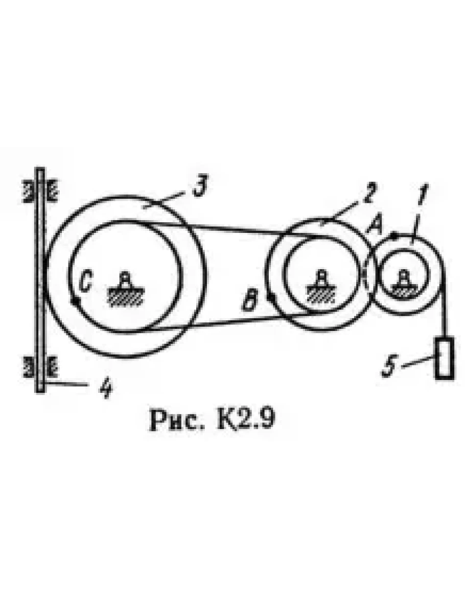 Механизм состоит из ступенчатых колес 1—3, находящихся в зацеплении или связанных ременной передачей, зубчатой рейки 4 и груза 5, привязанного к концу нити, намотанной на одно из колес (рис. К2.0 — К2.9, табл. К2). Радиусы ступеней колес равны соответственно: у колеса 1 – r1 = 2 см, R1 = 4 см, у колеса 2 – r2 = 6 см, R2 = 8 см, у колеса 3 – r3 — 12 см, R3 = 16 см. На ободьях колес расположены точки A, В и С. В столбце «Дано» таблицы указан закон движения или закон изменения скорости ведущего звена механизма, где φ1(t) — закон вращения колеса 1, s2(f) — закон движения рейки 4, ω2(t) — закон изменения угловой скорости колеса 2, v5(t) — закон изменения скорости груза 5 и т. д. (везде φ выражено в радианах, s — в сантиметрах, t — в секундах). Положительное направление для φ и ω против хода часовой стрелки, для s4, s5 и v4, v5 — вниз. Определить в момент времени t1 = 2 с указанные в таблице в столбцах «Найти» скорости (v — линейные, ω — угловые) и ускорения (а — линейные, ε — угловые) соответствующих точек или тел (v5 — скорость груза 5 и т. д.).