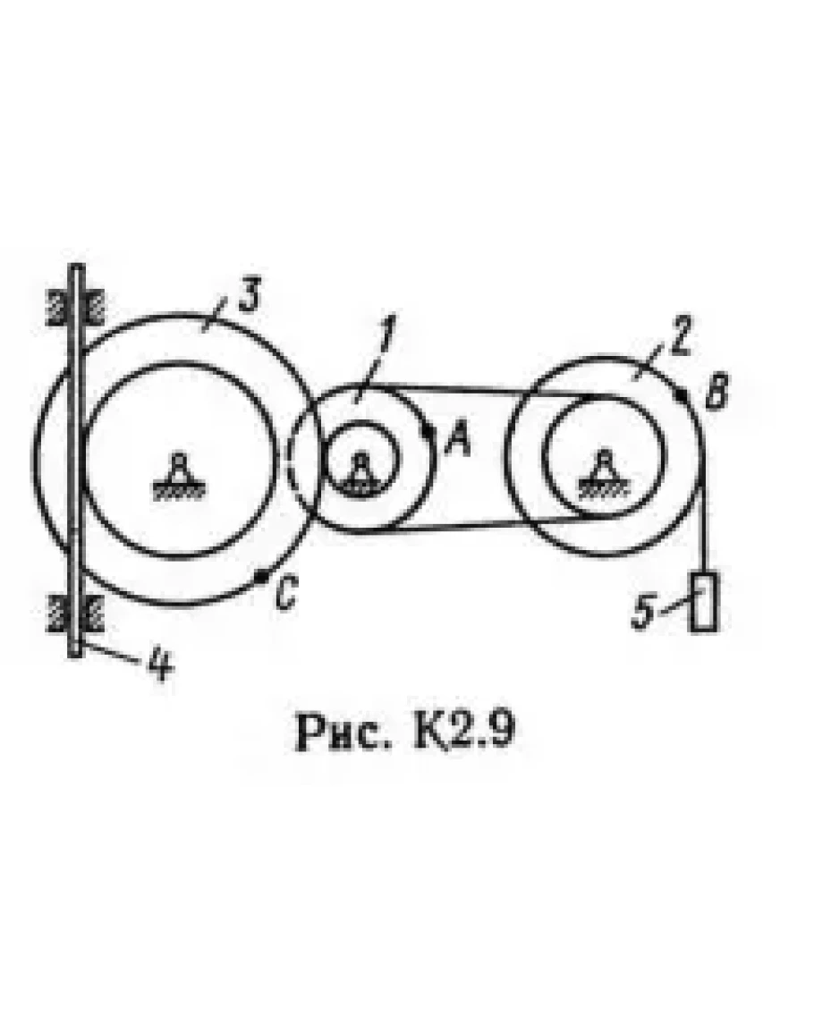 Механизм состоит из ступенчатых колес 1—3, находящихся в зацеплении или связанных ременной передачей, зубчатой рейки 4 и груза 5, привязанного к концу нити, намотанной на одно из колес (рис. К2.0 — К2.9, табл. К2). Радиусы ступеней колес равны соответственно: у колеса 1 – r1 = 2 см, R1 = 4 см, у колеса 2 – r2 = 6 см, R2 = 8 см, у колеса 3 – r3 — 12 см, R3 = 16 см. На ободьях колес расположены точки A, В и С.