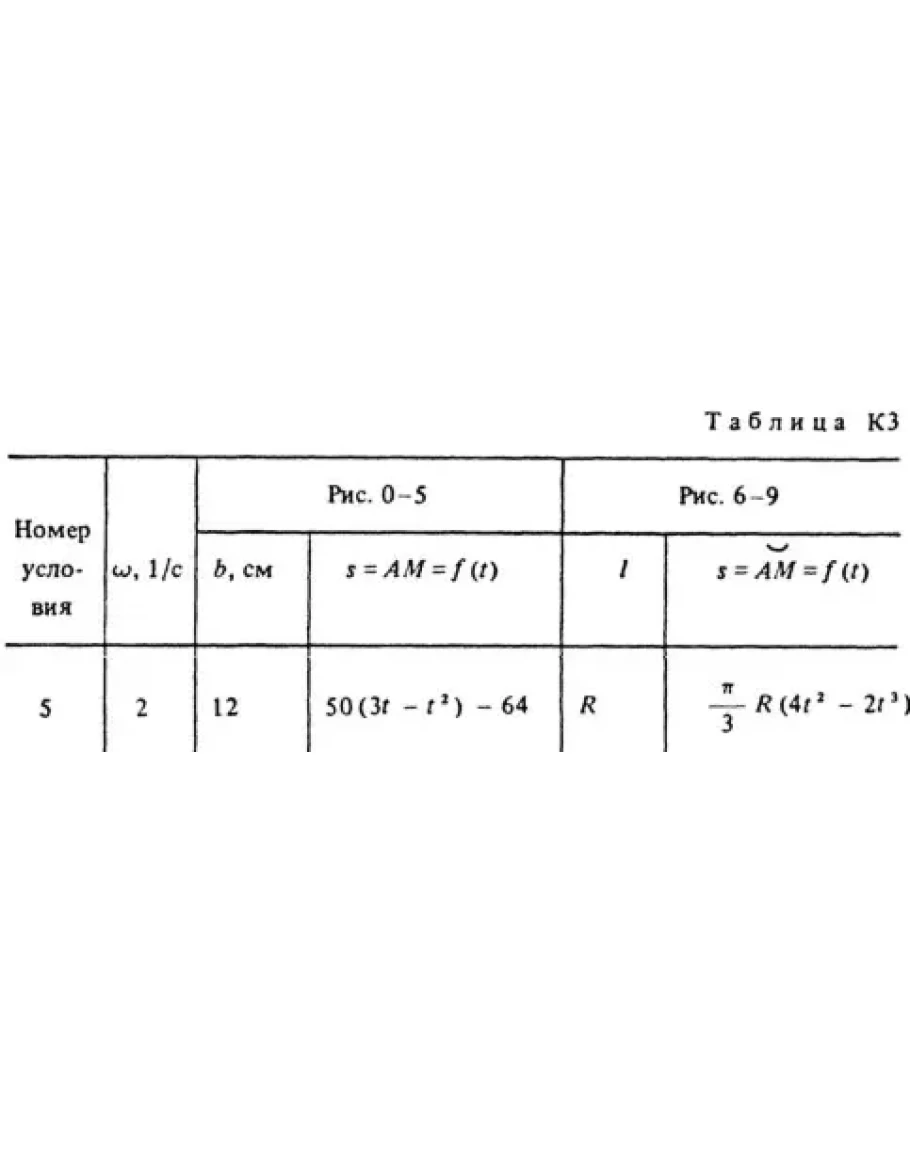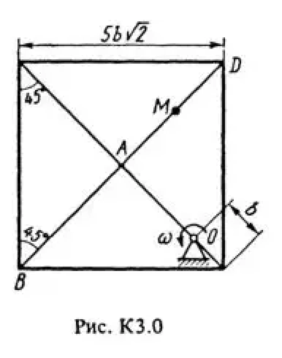 Прямоугольная пластина (рис. К3.0-К3.5) или круглая пластина радиусом R = 60 см (рис. К3.6-К3.9) вращается вокруг неподвижной оси с постоянной угловой скоростью ω, заданной в табл. К3 (при знаке минус направление ω противоположно показанному на рисунке). Ось вращения на рис. К3.0-К3.3 и К3.8, К3.9 перпендикулярна плоскости пластины и проходит через точку О (пластина вращается в своей плоскости); на рис. К3.4-К3.7 ось вращения ОО1 лежит в плоскости пластины (пластина вращается в пространстве). По пластине вдоль прямой BD (рис. К3.0-К3.5) или по окружности радиуса R, т. е. по ободу пластины (рис. К3.6-К3.9), движется точка М. Закон ее относительного движения, выражаемый уравнением s = AM = f(t) (s – в сантиметрах, t – в секундах), задан в табл. К3 отдельно для рис. К3.0-К3.5 и для рис. К3.6-К3.9,при этом на рис. 6-9 s = AM и отсчитывается по дуге окружности; там же даны размеры b и l. На всех рисунках точка М показаны в положении, при котором s = AM > 0 (при s < 0 точка М находится по другую сторону от точки A). Определить абсолютную скорость и абсолютное ускорение точки М в момент времени t1 = 1 с.