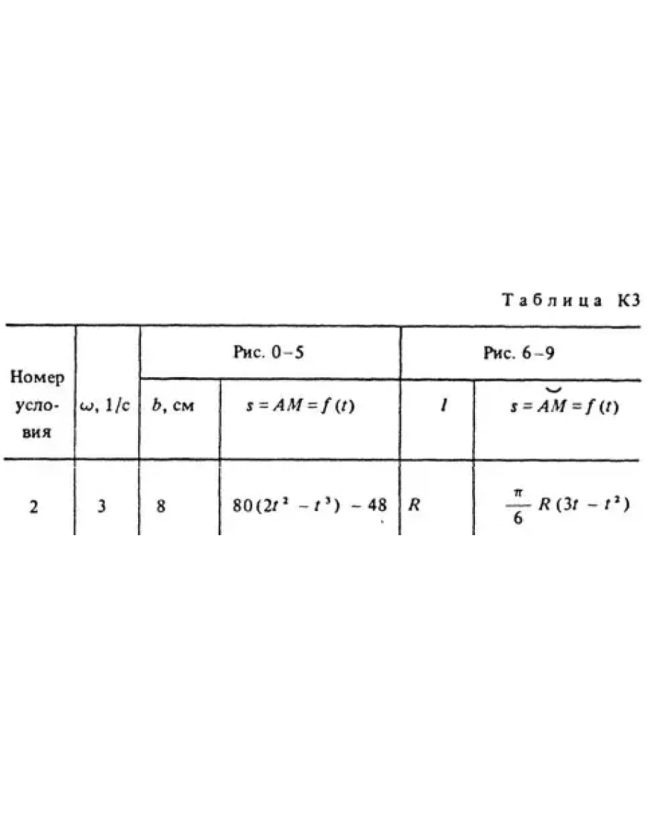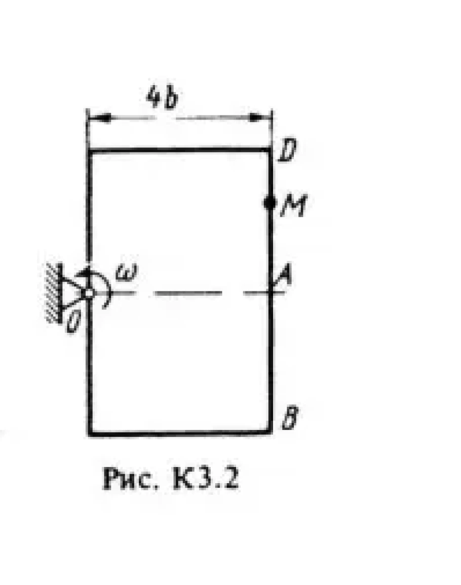 Прямоугольная пластина (рис. К3.0-К3.5) или круглая пластина радиусом R = 60 см (рис. К3.6-К3.9) вращается вокруг неподвижной оси с постоянной угловой скоростью ω, заданной в табл. К3 (при знаке минус направление ω противоположно показанному на рисунке). Ось вращения на рис. К3.0-К3.3 и К3.8, К3.9 перпендикулярна плоскости пластины и проходит через точку О (пластина вращается в своей плоскости); на рис. К3.4-К3.7 ось вращения ОО1 лежит в плоскости пластины (пластина вращается в пространстве). По пластине вдоль прямой BD (рис. К3.0-К3.5) или по окружности радиуса R, т. е. по ободу пластины (рис. К3.6-К3.9), движется точка М. Закон ее относительного движения, выражаемый уравнением s = AM = f(t) (s – в сантиметрах, t – в секундах), задан в табл. К3 отдельно для рис. К3.0-К3.5 и для рис. К3.6-К3.9,при этом на рис. 6-9 s = AM и отсчитывается по дуге окружности; там же даны размеры b и l. На всех рисунках точка М показаны в положении, при котором s = AM > 0 (при s < 0 точка М находится по другую сторону от точки A). Определить абсолютную скорость и абсолютное ускорение точки М в момент времени t1 = 1 с.