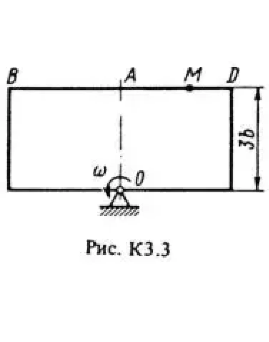 Прямоугольная пластина (рис. К3.0-К3.5) или круглая пластина радиусом R = 60 см (рис. К3.6-К3.9) вращается вокруг неподвижной оси с постоянной угловой скоростью ω, заданной в табл. К3 (при знаке минус направление ω противоположно показанному на рисунке). Ось вращения на рис. К3.0-К3.3 и К3.8, К3.9 перпендикулярна плоскости пластины и проходит через точку О (пластина вращается в своей плоскости); на рис. К3.4-К3.7 ось вращения ОО1 лежит в плоскости пластины (пластина вращается в пространстве). По пластине вдоль прямой BD (рис. К3.0-К3.5) или по окружности радиуса R, т. е. по ободу пластины (рис. К3.6-К3.9), движется точка М. Закон ее относительного движения, выражаемый уравнением s = AM = f(t) (s – в сантиметрах, t – в секундах), задан в табл. К3 отдельно для рис. К3.0-К3.5 и для рис. К3.6-К3.9,при этом на рис. 6-9 s = AM и отсчитывается по дуге окружности; там же даны размеры b и l. На всех рисунках точка М показаны в положении, при котором s = AM > 0 (при s < 0 точка М находится по другую сторону от точки A). Определить абсолютную скорость и абсолютное ускорение точки М в момент времени t1 = 1 с.