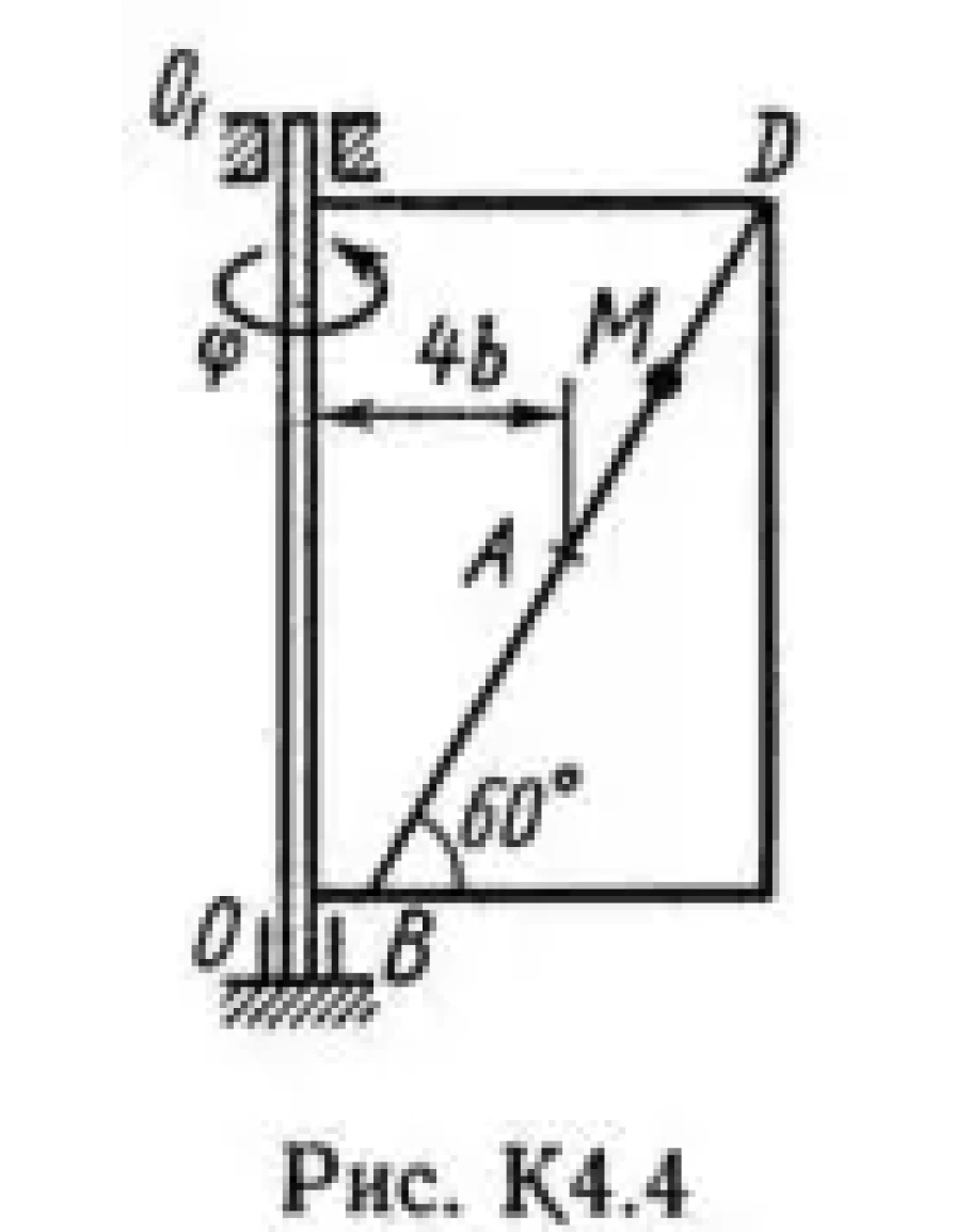 Прямоугольная пластина (рис. К4.0 — К4.4) или круглая пластина радиуса R = 60 см (рис. К4.5 — К4.9) вращается вокруг неподвижной оси по закону φ = f1(t), заданному в табл. К4. Положительное направление отсчета угла φ показано на рисунках дуговой стрелкой. На рис. 0, 1, 2, 5, 6 ось вращения перпендикулярна плоскости пластины и проходит через точку О (пластина вращается в своей плоскости); на рис. 3, 4, 7, 8, 9 ось вращения OO1 лежит в плоскости пластины (пластина вращается в пространстве). По пластине вдоль прямой BD (рис. 0—4) или по окружности радиуса R (рис. 5—9) движется точка М; закон ее относительного движения, т. е. зависимость s = AM = f2(t) (s выражено в сантиметрах, t — в секундах), задан в таблице отдельно для рис. 0—4 и для рис. 5—9; там же даны размеры b и l. На рисунках точка М показана в положении, при котором s = АМ>0 (при s<0 точка М находится по другую сторону от точки А). Найти абсолютную скорость и абсолютное ускорение точки М в момент времени t1 = 1 с.