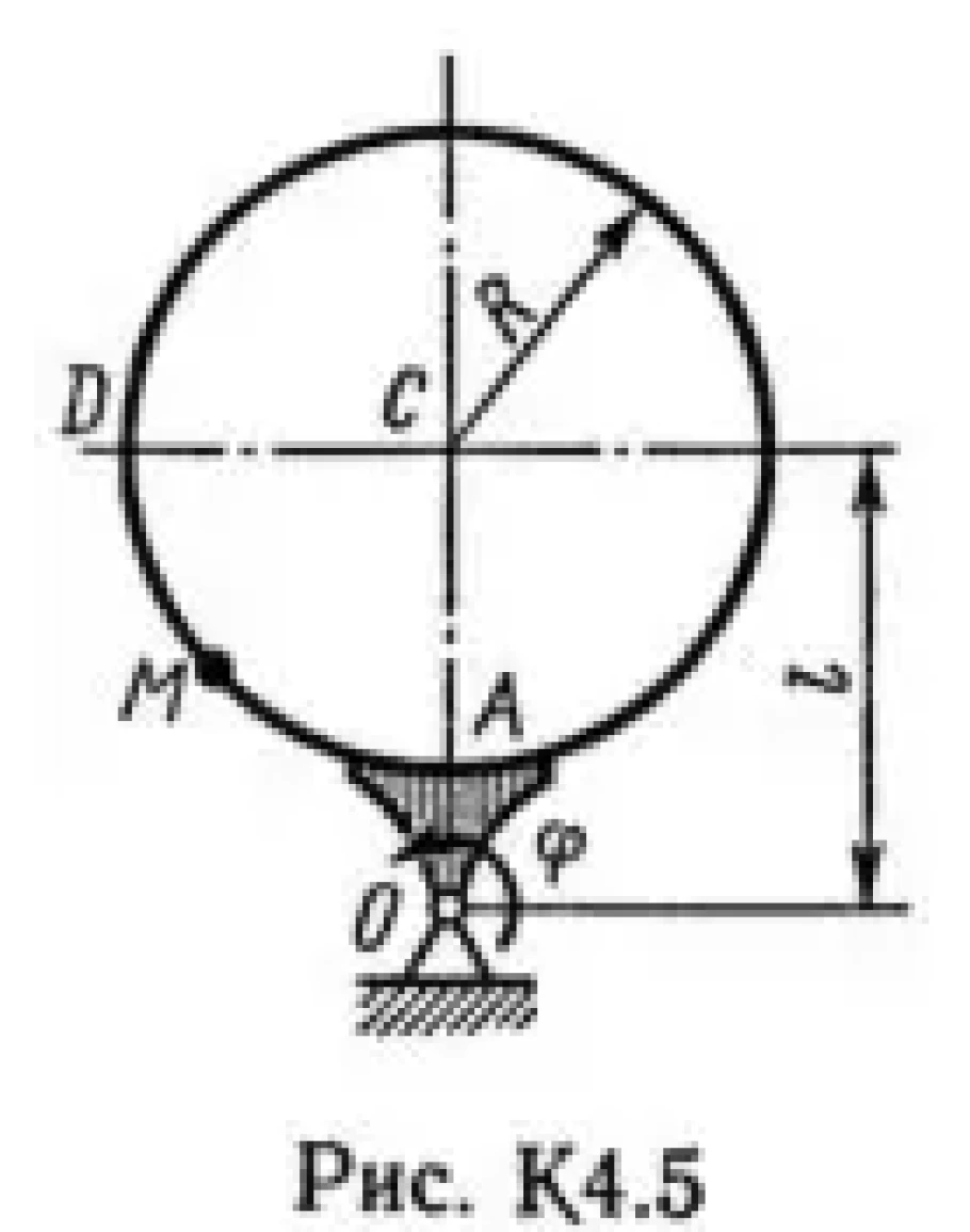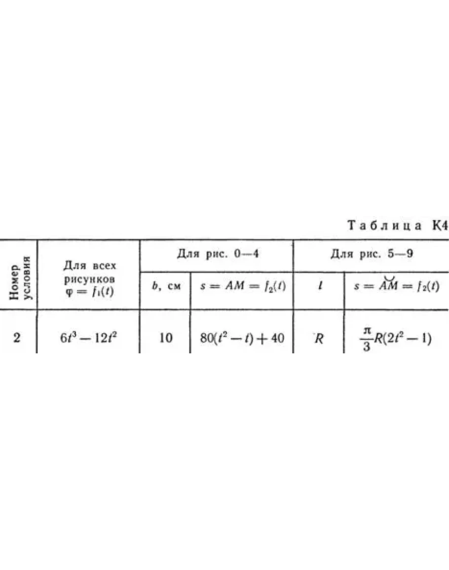 Прямоугольная пластина (рис. К4.0 — К4.4) или круглая пластина радиуса R = 60 см (рис. К4.5 — К4.9) вращается вокруг неподвижной оси по закону φ = f1(t), заданному в табл. К4. Положительное направление отсчета угла φ показано на рисунках дуговой стрелкой. На рис. 0, 1, 2, 5, 6 ось вращения перпендикулярна плоскости пластины и проходит через точку О (пластина вращается в своей плоскости); на рис. 3, 4, 7, 8, 9 ось вращения OO1 лежит в плоскости пластины (пластина вращается в пространстве). По пластине вдоль прямой BD (рис. 0—4) или по окружности радиуса R (рис. 5—9) движется точка М; закон ее относительного движения, т. е. зависимость s = AM = f2(t) (s выражено в сантиметрах, t — в секундах), задан в таблице отдельно для рис. 0—4 и для рис. 5—9; там же даны размеры b и l. На рисунках точка М показана в положении, при котором s = АМ>0 (при s<0 точка М находится по другую сторону от точки А). Найти абсолютную скорость и абсолютное ускорение точки М в момент времени t1 = 1 с.