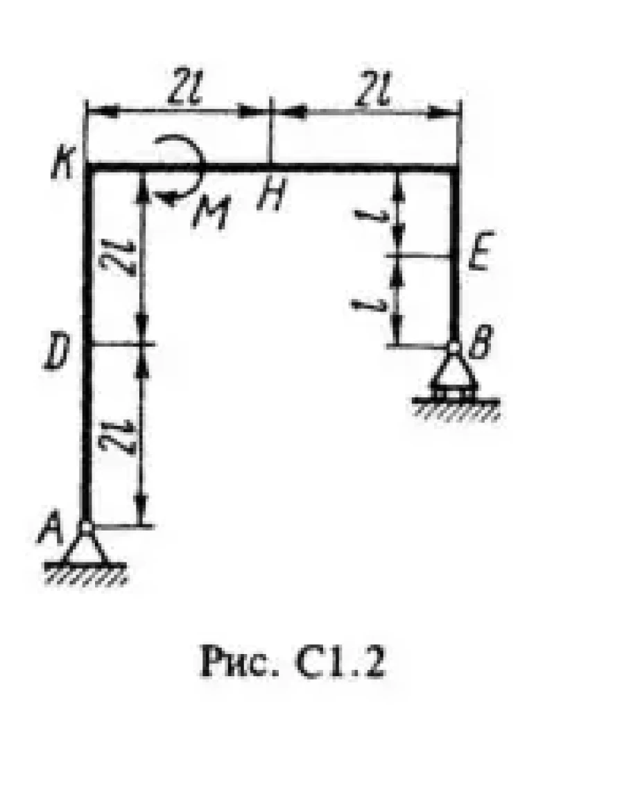 Жесткая рама, расположенная в вертикальной плоскости (рис. С1.0 — С1.9, табл. С1), закреплена в точке А шарнирно, а в точке В прикреплена или к невесомому стержню ВВ1, или к шарнирной опоре на катках; стержень прикреплен к раме и к неподвижной опоре шарнирами. На раму действуют пара сил с моментом М = 100 кН·м и две силы, значения, направления и точки приложения которых указаны в таблице (например, в условиях № 1 на раму действует сила F1 = 10 Н под углом 30° к горизонтальной оси, приложенная в точке K и сила F4 = 40 Н под углом 60° к горизонтальной оси, приложенная в точке H, и т. д.). Определить реакции связей в точках A, В, вызываемые заданными нагрузками. При окончательных расчетах принять l = 0,5 м.