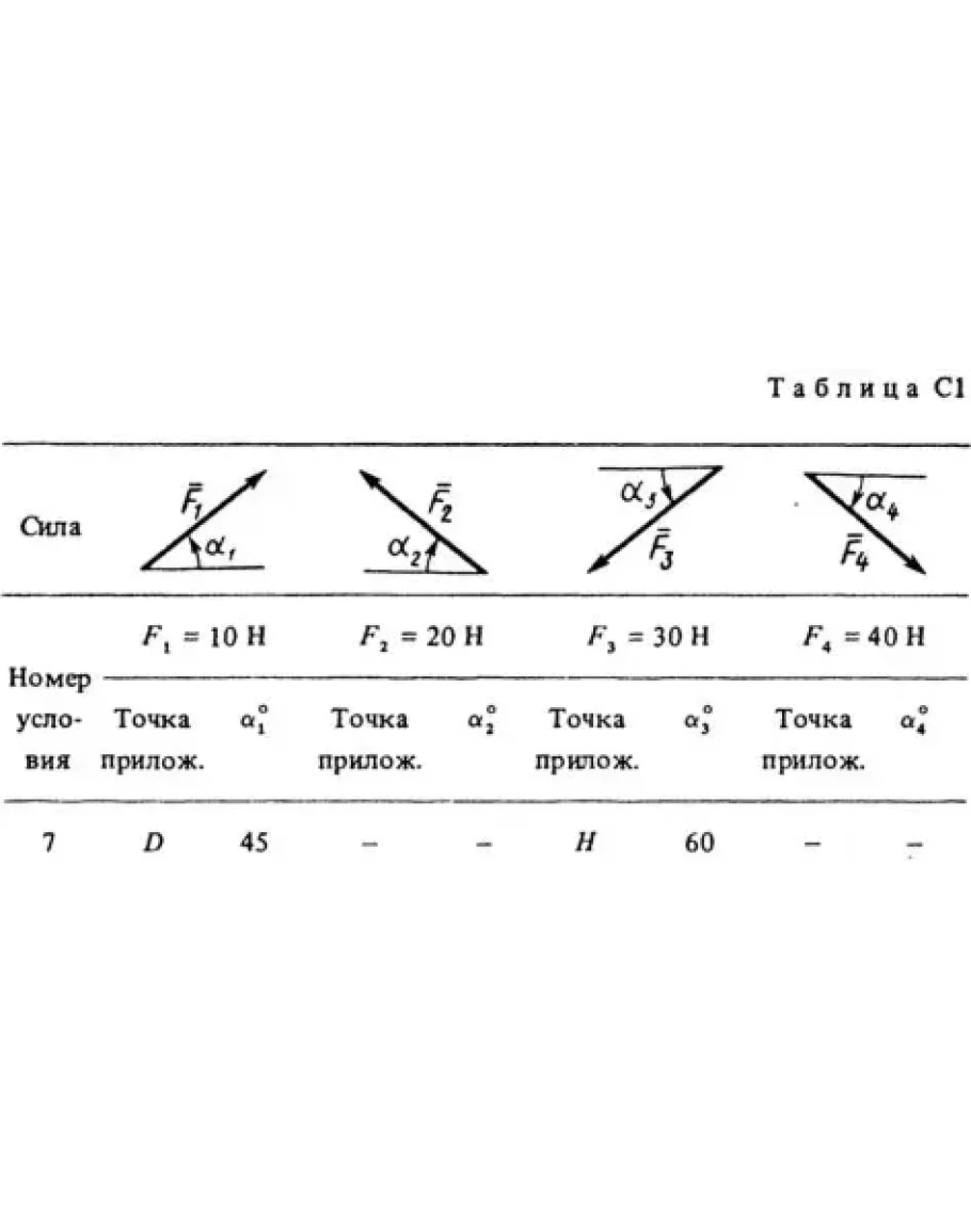 Жесткая рама, расположенная в вертикальной плоскости (рис. С1.0 — С1.9, табл. С1), закреплена в точке А шарнирно, а в точке В прикреплена или к невесомому стержню ВВ1, или к шарнирной опоре на катках; стержень прикреплен к раме и к неподвижной опоре шарнирами. На раму действуют пара сил с моментом М = 100 кН·м и две силы, значения, направления и точки приложения которых указаны в таблице (например, в условиях № 1 на раму действует сила F1 = 10 Н под углом 30° к горизонтальной оси, приложенная в точке K и сила F4 = 40 Н под углом 60° к горизонтальной оси, приложенная в точке H, и т. д.). Определить реакции связей в точках A, В, вызываемые заданными нагрузками. При окончательных расчетах принять l = 0,5 м.