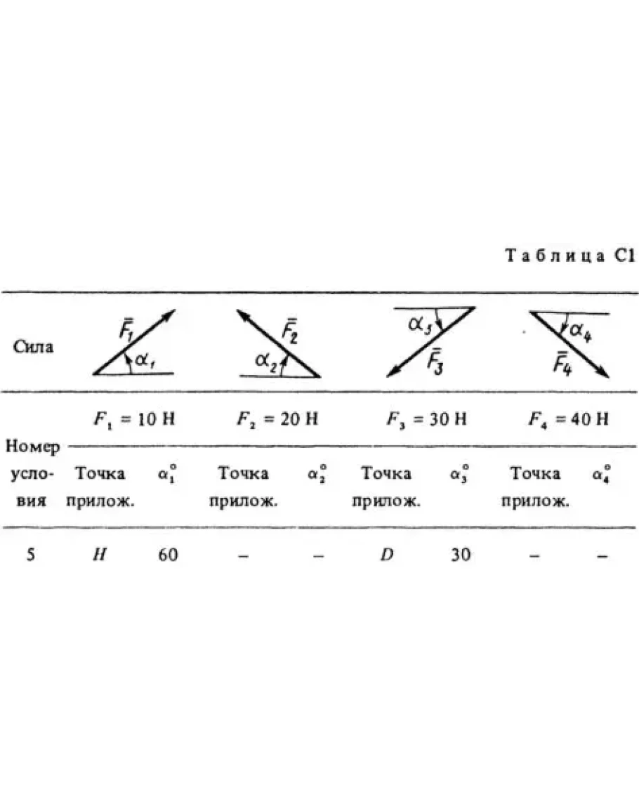 Жесткая рама, расположенная в вертикальной плоскости (рис. С1.0 — С1.9, табл. С1), закреплена в точке А шарнирно, а в точке В прикреплена или к невесомому стержню ВВ1, или к шарнирной опоре на катках; стержень прикреплен к раме и к неподвижной опоре шарнирами. На раму действуют пара сил с моментом М = 100 кН·м и две силы, значения, направления и точки приложения которых указаны в таблице (например, в условиях № 1 на раму действует сила F1 = 10 Н под углом 30° к горизонтальной оси, приложенная в точке K и сила F4 = 40 Н под углом 60° к горизонтальной оси, приложенная в точке H, и т. д.). Определить реакции связей в точках A, В, вызываемые заданными нагрузками. При окончательных расчетах принять l = 0,5 м.