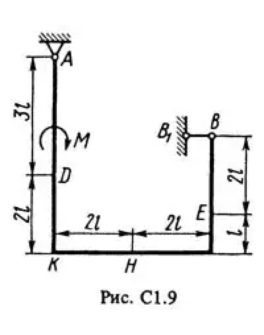 Жесткая рама, расположенная в вертикальной плоскости (рис. С1.0 — С1.9, табл. С1), закреплена в точке А шарнирно, а в точке В прикреплена или к невесомому стержню ВВ1, или к шарнирной опоре на катках; стержень прикреплен к раме и к неподвижной опоре шарнирами. На раму действуют пара сил с моментом М = 100 кН·м и две силы, значения, направления и точки приложения которых указаны в таблице (например, в условиях № 1 на раму действует сила F1 = 10 Н под углом 30° к горизонтальной оси, приложенная в точке K и сила F4 = 40 Н под углом 60° к горизонтальной оси, приложенная в точке H, и т. д.). Определить реакции связей в точках A, В, вызываемые заданными нагрузками. При окончательных расчетах принять l = 0,5 м.