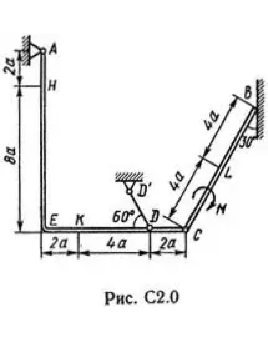 Конструкция состоит из жесткого угольника и стержня, которые в точке С или соединены друг с другом шарнирно (рис. С2.0 — С2.5), или свободно опираются друг о друга (рис. С2.6 — С2.9). Внешними связями, наложенными на конструкцию, являются в точке А или шарнир, или жесткая заделка; в точке В или гладкая плоскость (рис. 0 и 1), или невесомый стержень ВВ' (рис. 2 и 3), или шарнир (рис. 4—9); в точке D или невесомый стержень DD' (рис. 0, 3, 8), или шарнирная опора на катках (рис. 7). На каждую конструкцию действуют: пара сил с моментом М = 60 кН·м, равномерно распределенная нагрузка интенсивности q = 20 кН/м и еще две силы. Эти силы, их направления и точки приложения указаны в табл. С2; там же в столбце «Нагруженный участок» указано, на каком участке действует распределенная нагрузка (например, в условиях № 1 на конструкцию действуют сила F2 под углом 60° к горизонтальной оси, приложенная в точке L, сила F4 под углом 30° к горизонтальной оси, приложенная в точке Е, и нагрузка, распределенная на участке СK). Определить реакции связей в точках А, В, С (для рис. 0, 3, 7, 8 еще и в точке D), вызванные заданными нагрузками. При окончательных расчетах принять а = 0,2 м.