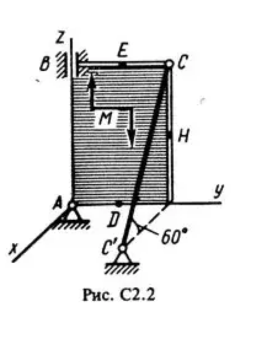 Однородная прямоугольная плита весом P = 5 кН со сторонами AB = 3l, BC = 2l закреплена в точке А сферическим шарниром (подшипником) и удерживается в равновесии невесомым стержнем CC' (рис. С2.0 – С2.9). На плиту действуют пара сил с моментом M = 6 кН·м, лежащая в плоскости плиты, и две силы. Значения этих сил, их направления и точки приложения указаны в табл. С2; при этом силы F1 и F4 лежат в плоскостях, параллельных плоскости xy, сила F2 – в плоскости, параллельной xz, сила F3 – в плоскости, параллельной yz. Точки приложения сил (D, E, H) находятся в серединах сторон плиты. Определить реакции связей в точках A, B и C. При подсчетах принять l = 0,8 м.