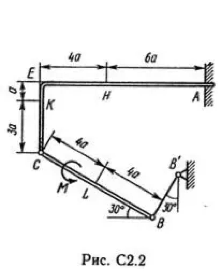 Конструкция состоит из жесткого угольника и стержня, которые в точке С или соединены друг с другом шарнирно (рис. С2.0 — С2.5), или свободно опираются друг о друга (рис. С2.6 — С2.9). Внешними связями, наложенными на конструкцию, являются в точке А или шарнир, или жесткая заделка; в точке В или гладкая плоскость (рис. 0 и 1), или невесомый стержень ВВ' (рис. 2 и 3), или шарнир (рис. 4—9); в точке D или невесомый стержень DD' (рис. 0, 3, 8), или шарнирная опора на катках (рис. 7). На каждую конструкцию действуют: пара сил с моментом М = 60 кН·м, равномерно распределенная нагрузка интенсивности q = 20 кН/м и еще две силы. Эти силы, их направления и точки приложения указаны в табл. С2; там же в столбце «Нагруженный участок» указано, на каком участке действует распределенная нагрузка (например, в условиях № 1 на конструкцию действуют сила F2 под углом 60° к горизонтальной оси, приложенная в точке L, сила F4 под углом 30° к горизонтальной оси, приложенная в точке Е, и нагрузка, распределенная на участке СK). Определить реакции связей в точках А, В, С (для рис. 0, 3, 7, 8 еще и в точке D), вызванные заданными нагрузками. При окончательных расчетах принять а = 0,2 м.