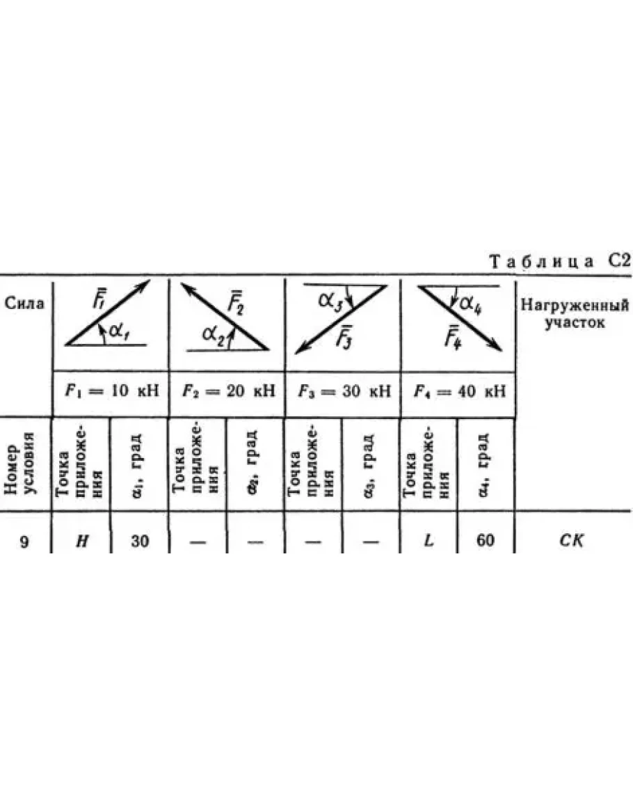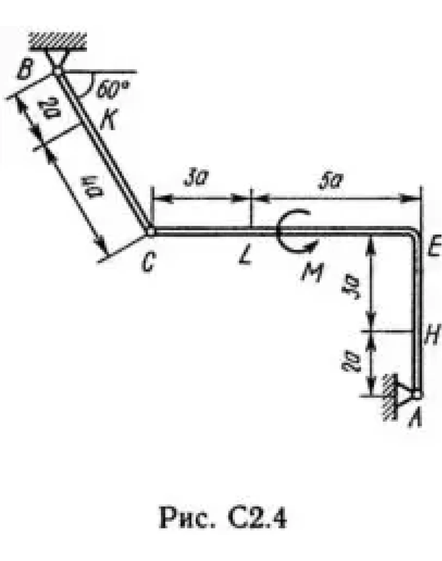 Конструкция состоит из жесткого угольника и стержня, которые в точке С или соединены друг с другом шарнирно (рис. С2.0 — С2.5), или свободно опираются друг о друга (рис. С2.6 — С2.9). Внешними связями, наложенными на конструкцию, являются в точке А или шарнир, или жесткая заделка; в точке В или гладкая плоскость (рис. 0 и 1), или невесомый стержень ВВ' (рис. 2 и 3), или шарнир (рис. 4—9); в точке D или невесомый стержень DD' (рис. 0, 3, 8), или шарнирная опора на катках (рис. 7). На каждую конструкцию действуют: пара сил с моментом М = 60 кН·м, равномерно распределенная нагрузка интенсивности q = 20 кН/м и еще две силы. Эти силы, их направления и точки приложения указаны в табл. С2; там же в столбце «Нагруженный участок» указано, на каком участке действует распределенная нагрузка (например, в условиях № 1 на конструкцию действуют сила F2 под углом 60° к горизонтальной оси, приложенная в точке L, сила F4 под углом 30° к горизонтальной оси, приложенная в точке Е, и нагрузка, распределенная на участке СK). Определить реакции связей в точках А, В, С (для рис. 0, 3, 7, 8 еще и в точке D), вызванные заданными нагрузками. При окончательных расчетах принять а = 0,2 м.