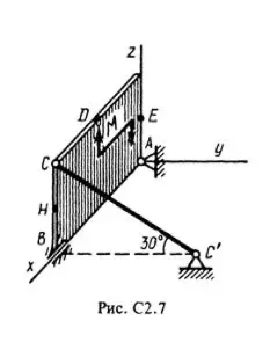 Однородная прямоугольная плита весом P = 5 кН со сторонами AB = 3l, BC = 2l закреплена в точке А сферическим шарниром (подшипником) и удерживается в равновесии невесомым стержнем CC' (рис. С2.0 – С2.9). На плиту действуют пара сил с моментом M = 6 кН·м, лежащая в плоскости плиты, и две силы. Значения этих сил, их направления и точки приложения указаны в табл. С2; при этом силы F1 и F4 лежат в плоскостях, параллельных плоскости xy, сила F2 – в плоскости, параллельной xz, сила F3 – в плоскости, параллельной yz. Точки приложения сил (D, E, H) находятся в серединах сторон плиты. Определить реакции связей в точках A, B и C. При подсчетах принять l = 0,8 м.