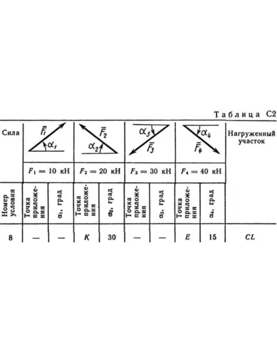 Конструкция состоит из жесткого угольника и стержня, которые в точке С или соединены друг с другом шарнирно (рис. С2.0 — С2.5), или свободно опираются друг о друга (рис. С2.6 — С2.9). Внешними связями, наложенными на конструкцию, являются в точке А или шарнир, или жесткая заделка; в точке В или гладкая плоскость (рис. 0 и 1), или невесомый стержень ВВ' (рис. 2 и 3), или шарнир (рис. 4—9); в точке D или невесомый стержень DD' (рис. 0, 3, 8), или шарнирная опора на катках (рис. 7). На каждую конструкцию действуют: пара сил с моментом М = 60 кН·м, равномерно распределенная нагрузка интенсивности q = 20 кН/м и еще две силы. Эти силы, их направления и точки приложения указаны в табл. С2; там же в столбце «Нагруженный участок» указано, на каком участке действует распределенная нагрузка (например, в условиях № 1 на конструкцию действуют сила F2 под углом 60° к горизонтальной оси, приложенная в точке L, сила F4 под углом 30° к горизонтальной оси, приложенная в точке Е, и нагрузка, распределенная на участке СK). Определить реакции связей в точках А, В, С (для рис. 0, 3, 7, 8 еще и в точке D), вызванные заданными нагрузками. При окончательных расчетах принять а = 0,2 м.