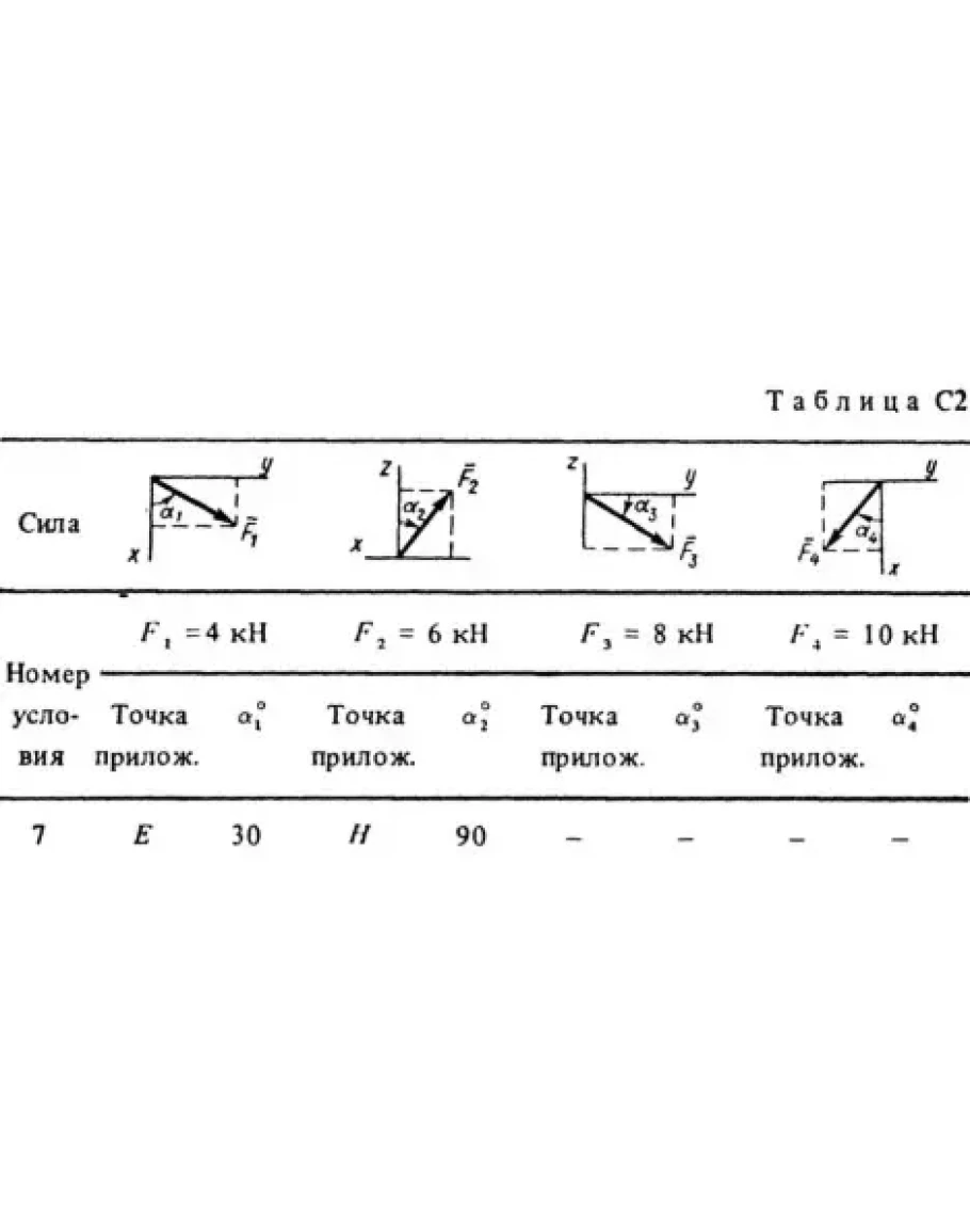 Однородная прямоугольная плита весом P = 5 кН со сторонами AB = 3l, BC = 2l закреплена в точке А сферическим шарниром (подшипником) и удерживается в равновесии невесомым стержнем CC' (рис. С2.0 – С2.9). На плиту действуют пара сил с моментом M = 6 кН·м, лежащая в плоскости плиты, и две силы. Значения этих сил, их направления и точки приложения указаны в табл. С2; при этом силы F1 и F4 лежат в плоскостях, параллельных плоскости xy, сила F2 – в плоскости, параллельной xz, сила F3 – в плоскости, параллельной yz. Точки приложения сил (D, E, H) находятся в серединах сторон плиты. Определить реакции связей в точках A, B и C. При подсчетах принять l = 0,8 м.