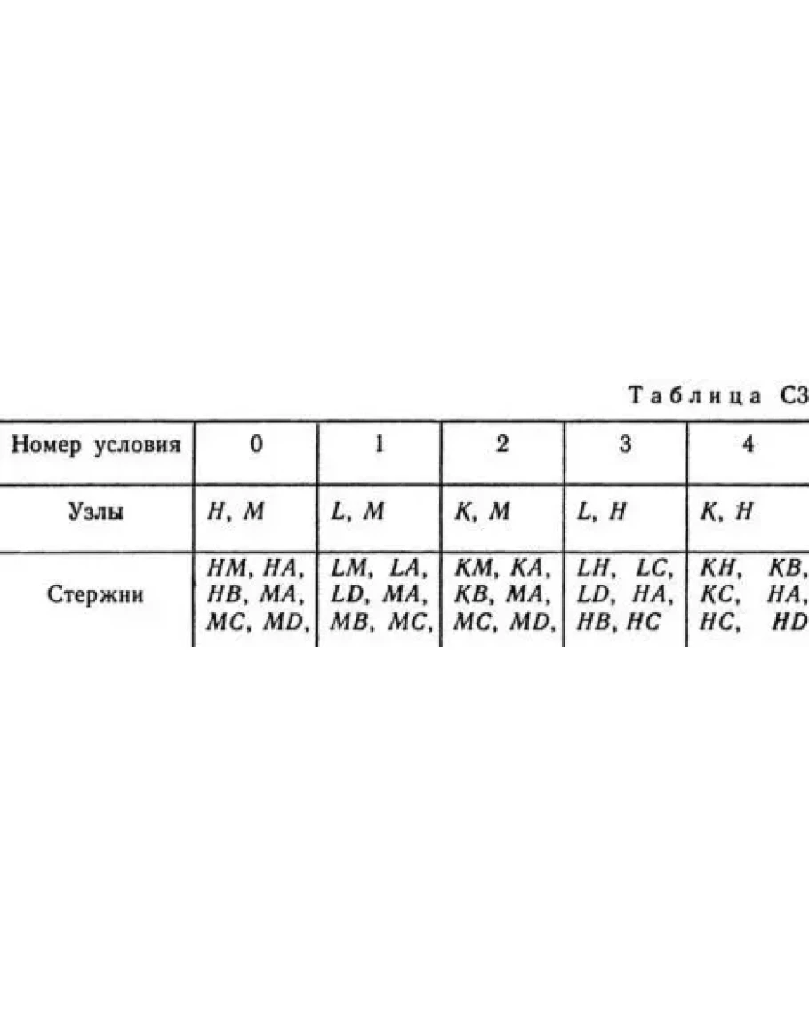 Шесть невесомых стержней соединены своими концами шарнирно друг с другом в двух узлах и прикреплены другими концами (тоже шарнирно) к неподвижным опорам А, В, С, D (рис. СЗ.0 — С3.9, табл. СЗ). Стержни и узлы (узлы расположены в вершинах H, К, L или М прямоугольного параллелепипеда) на рисунках не показаны и должны быть изображены решающим задачу по данным таблицы. В узле, который в каждом столбце таблицы указан первым, приложена сила Р = 200 Н; во втором узле приложена сила Q = 100 Н. Сила Р образует с положительными направлениями координатных осей х, у, z углы, равные соответственно α1 = 45°, β1 = 60°, γ1 = 60°, а сила Q — углы α2 = 60°, β2 = 45°, γ2 = 60°; направления осей х, у, z для всех рисунков показаны на рис. СЗ.0. Грани параллелепипеда, параллельные плоскости ху, — квадраты. Диагонали других боковых граней образуют с плоскостью ху угол φ = 60°, а диагональ параллелепипеда образует с этой плоскостью угол θ = 51°. Определить усилия в стержнях. На рис. С3.10 в качестве примера показано, как должен выглядеть чертеж СЗ. 1, если по условиям задачи узлы находятся в точках L и М, а стержнями являются LM, LA, LB; МА, МС, MD. Там же показаны углы φ и θ.