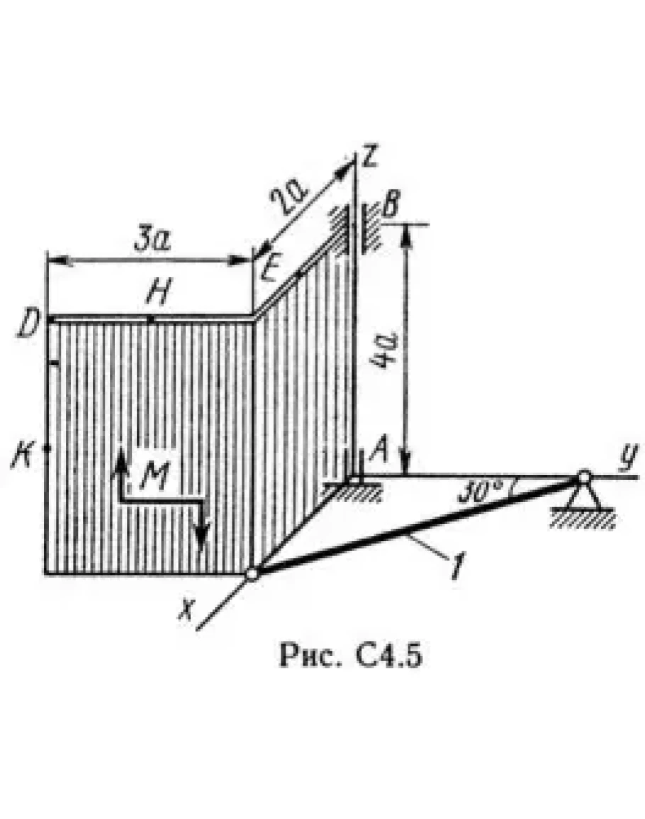 Две однородные прямоугольные тонкие плиты жестко соединены (сварены) под прямым углом друг к другу и закреплены сферическим шарниром (или подпятником) в точке А, цилиндрическим шарниром (подшипником) в точке В и невесомым стержнем 1 (рис. С4.0 — С4.7) или же двумя подшипниками в точках A и В и двумя невесомыми стержнями 1 и 2 (рис. С4.8, С4.9); все стержни прикреплены к плитам и к неподвижным опорам шарнирами. Размеры плит указаны на рисунках; вес большей плиты P1 = 5 кН, вес меньшей плиты P2 = 3 кН. Каждая из плит расположена параллельно одной из координатных плоскостей (плоскость ху — горизонтальная). На плиты действуют пара сил с моментом М = 4 кН·м, лежащая в плоскости одной из плит, и две силы. Значения этих сил, их направления и точки приложения указаны в табл. С4; при этом силы F1 и F4 лежат в плоскостях, параллельных плоскости ху, сила F2 — в плоскости, параллельной xz, и сила F3 — в плоскости, параллельной yz. Точки приложения сил (D, Е, Н, К) находятся в углах или в серединах сторон плит. Определить реакции связей в точках А и В и реакцию стержня (стержней). При подсчетах принять а = 0,6 м.