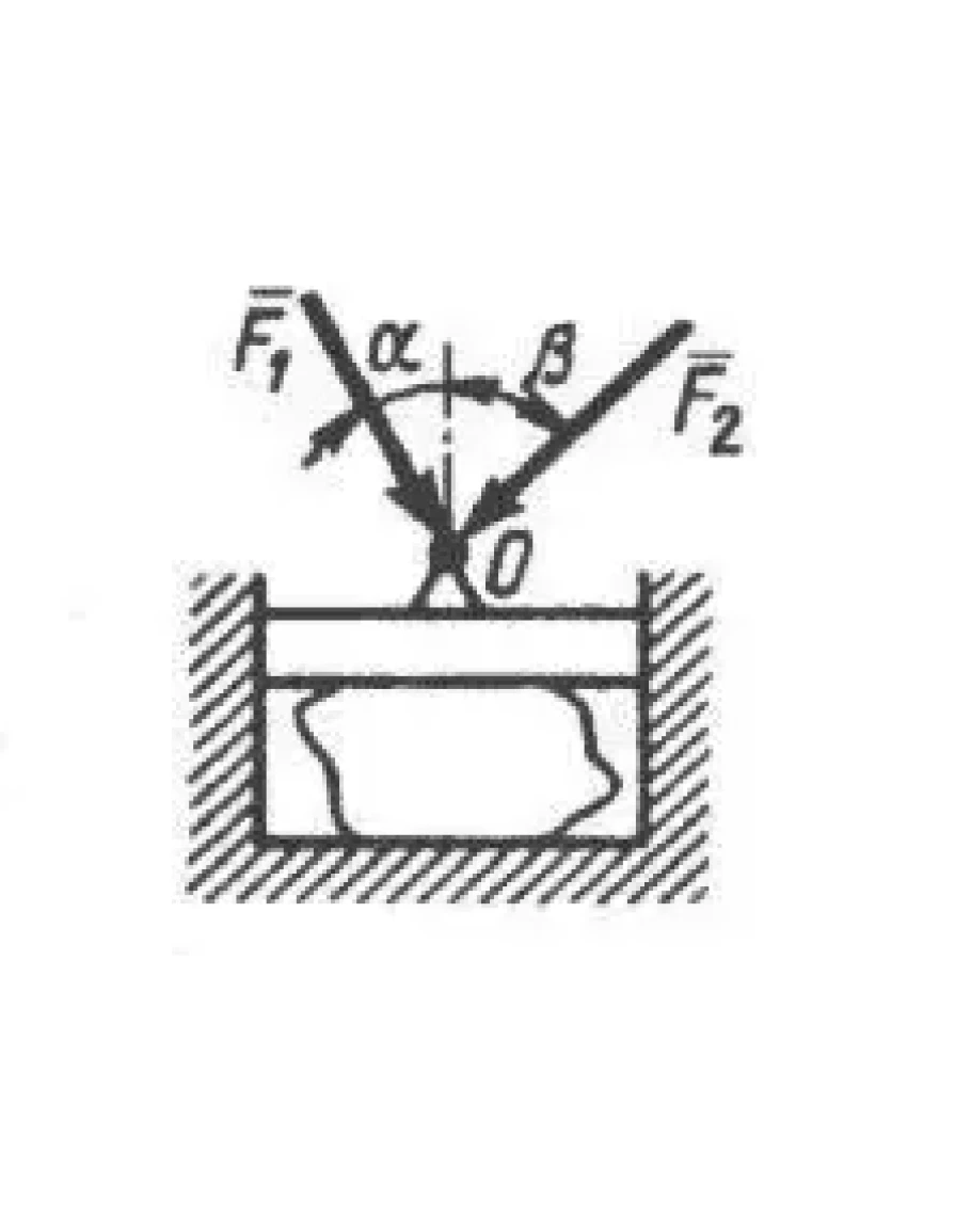 На пресс в точке О действуют силы F1=5Н и F2=7Н, линии действия которых находятся