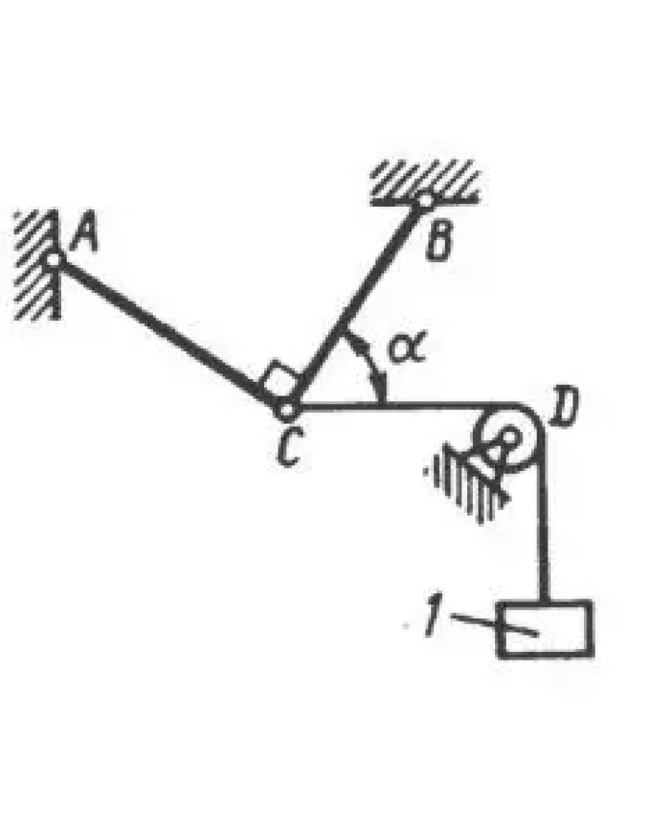 Два стержня АС и ВС соединены шарнирно в точке C, к которой через блок D подвешен