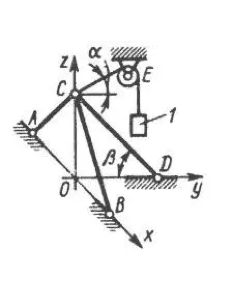 Груз 1 весом 60Н удерживается в равновесии стержнями AC, ВС и DC, шарнирно соединенными в точке С, и веревкой, переброшенной через блок Е под углом ?=30°. Определить усилие в стержне DC, если угол ?=45°. (Ответ -73,5)