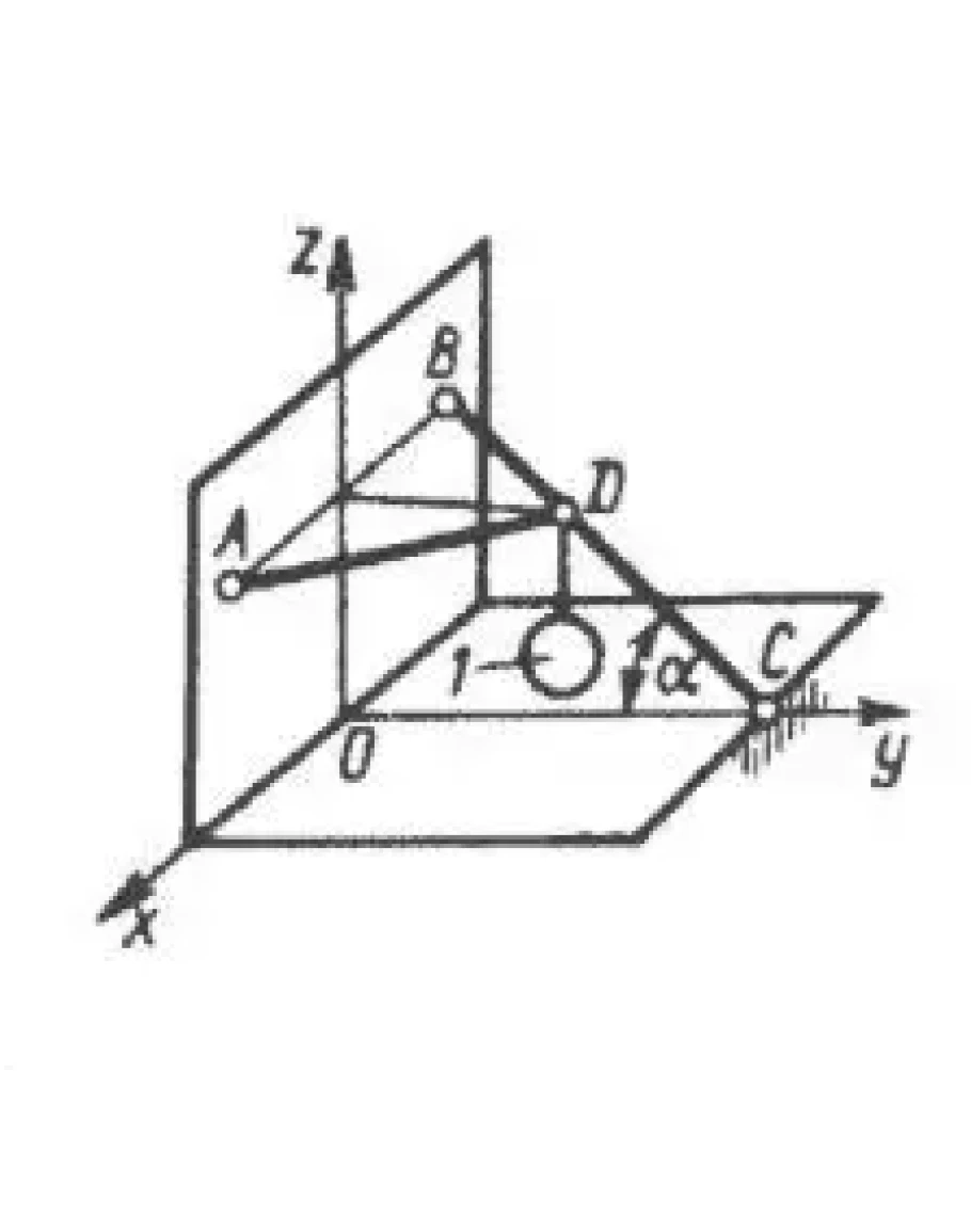 Три стержня AD, BD и CD соединены в шарнире D. Определить усилие в стержне CD, если груз 1 имеет вес 20Н, угол ?=45°. (Ответ -28,3)