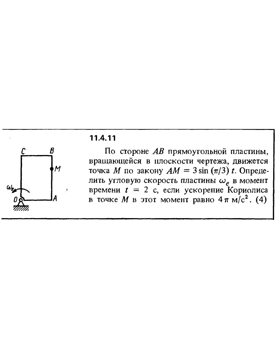 По стороне АВ прямоугольной пластины, вращающейся в плоскости чертежа, движется точка М по закону AM = 3sin(π/3)t. Определить угловую скорость пластины ωе в момент времени t = 2 с, если ускорение Кориолиса в точке М в этот момент равно 4π м/с2.