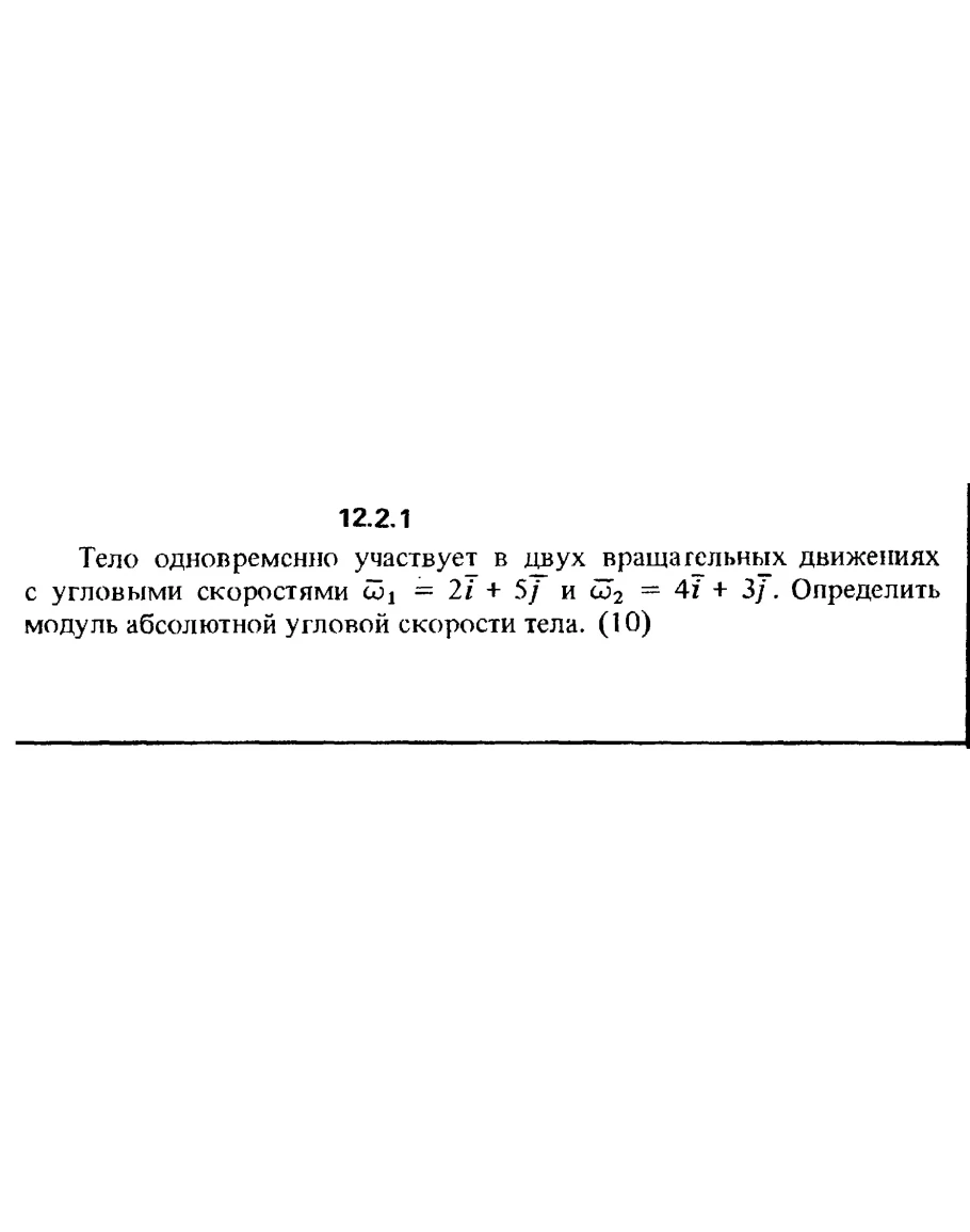 12.2.1 Тело одновременно участвует в двух вращательных движениях с угловыми скоростями ω1 = 2i + 5j и ω2 = 4i + 3j. Определить модуль абсолютной угловой скорости тела.