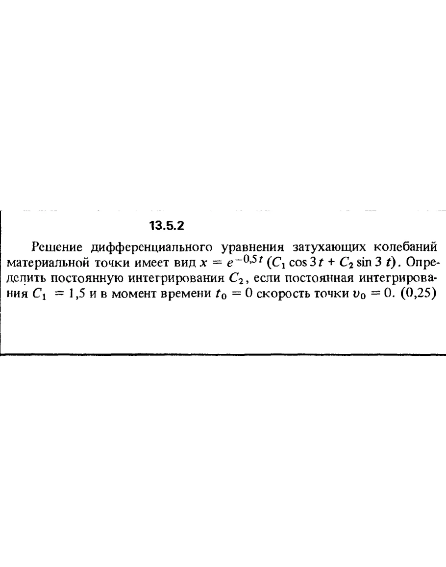 13.5.2. Решение дифференциального уравнения затухающих колебаний материальной точки имеет вид х = е-0,5t(С1cos3t + С2sin 3t). Определить постоянную интегрирования С2, если постоянная интегрирования C1 = 1,5 и в момент времени t0 = 0 скорость точки v0 = 0.