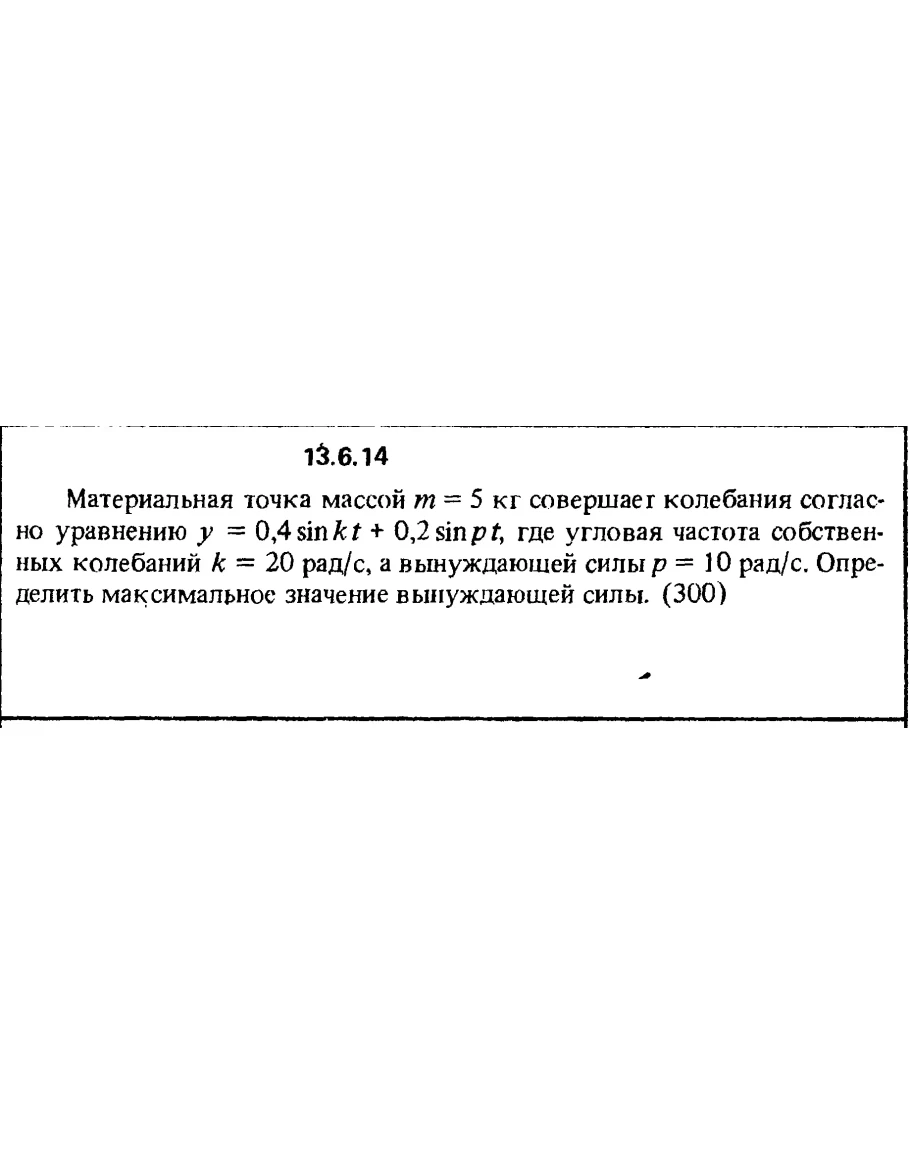 13.6.14. Материальная точка массой m = 5 кг совершает колебания согласно уравнению у = 0,4sin kt + 0,2sin pt, где угловая частота собственных колебаний k = 20 рад/с, а вынуждающей силы р = 10 рад/с. Определить максимальное значение вынуждающей силы.