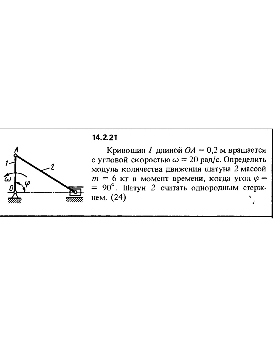 14.2.21. Кривошип 1 длиной ОА = 0,2 м вращается с угловой скоростью ω = 20 рад/с. Определить модуль количества движения шатуна 2 массой m = 6 кг в момент времени, когда угол φ = 90°. Шатун 2 считать однородным стержнем.
