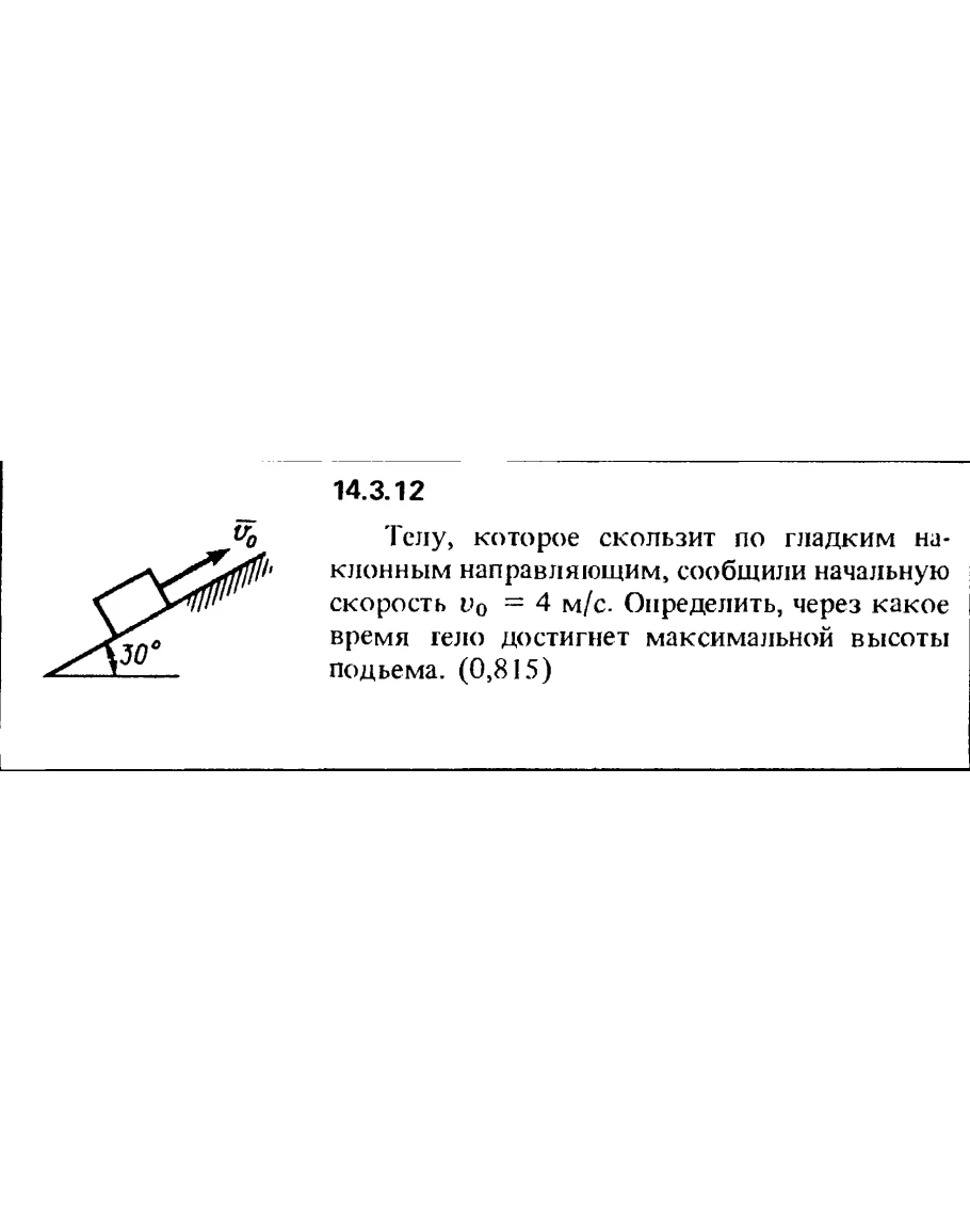 14.3.12. Телу, которое скользит по гладким наклонным направляющим, сообщили начальную скорость v0 = 4 м/с. Определить, через какое время тело достигнет максимальной высоты подъема.