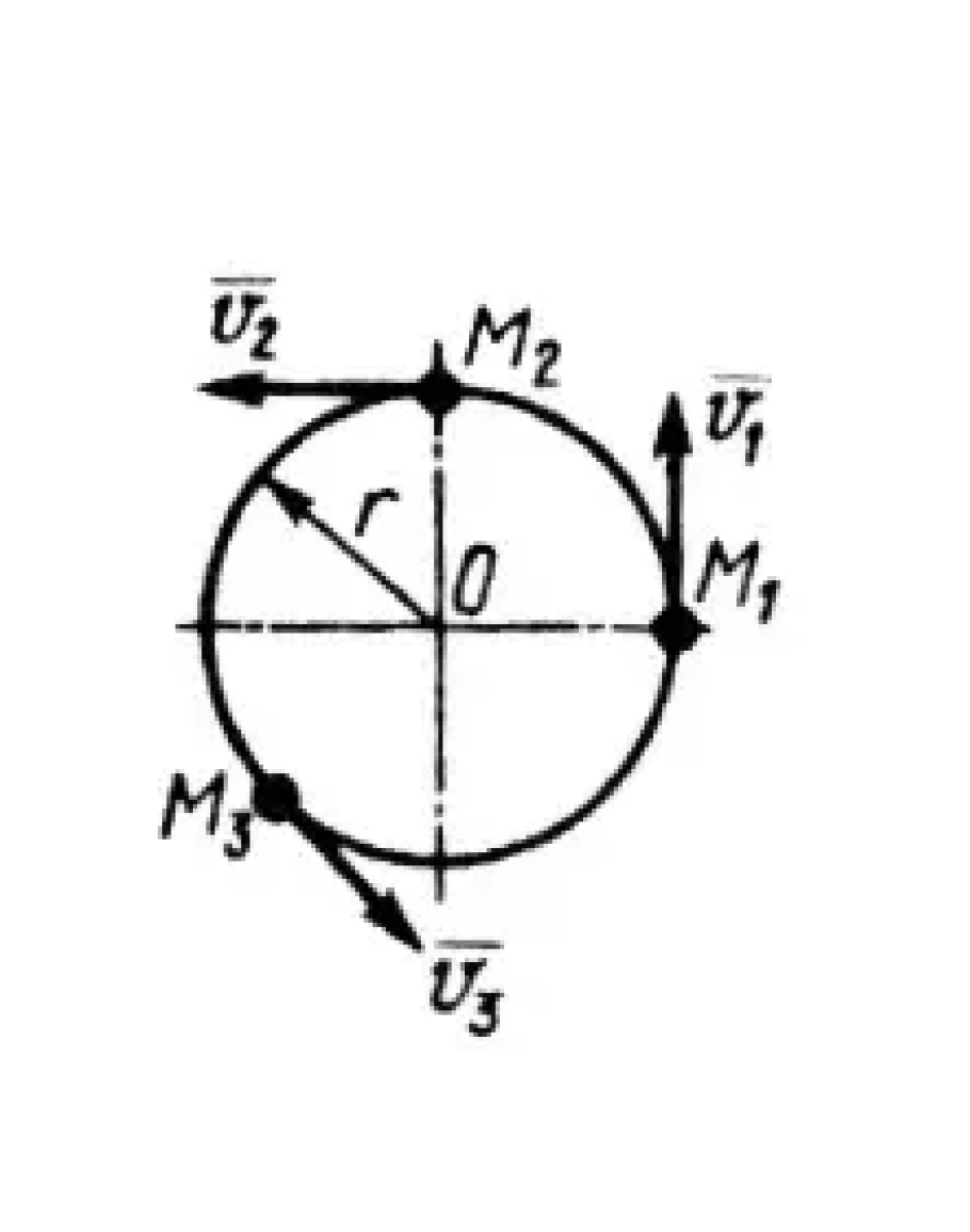 Материальные точки М1,М2,М3 массы которых m1 = m2 = m3 = 2 кг, движутся по окружности радиуса r = 0,5 м. Определить кинетический момент системы материальных точек относительно центра О окружности, если их скорости v1 = 2 м/с, v2 = 4 м/с,v3 = 6 м/с. (Ответ 12)