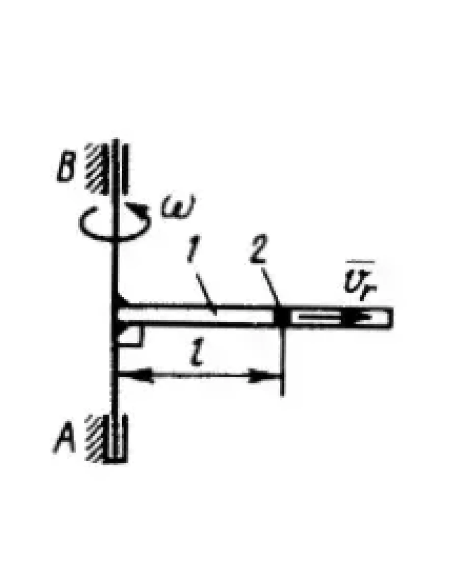 Трубка 1 вращается равномерно с угловой скоростью ? = 2 рад/с вокруг оси АВ. Внутри трубки движется шарик 2 массой m2 = 0,5 кг. Определить кинетическую энергию шарика в момент, когда он, находясь на расстоянии l = 0,5 м от оси, имеет относительную скорость vr = 0,2 м/с. (Ответ 0,26)