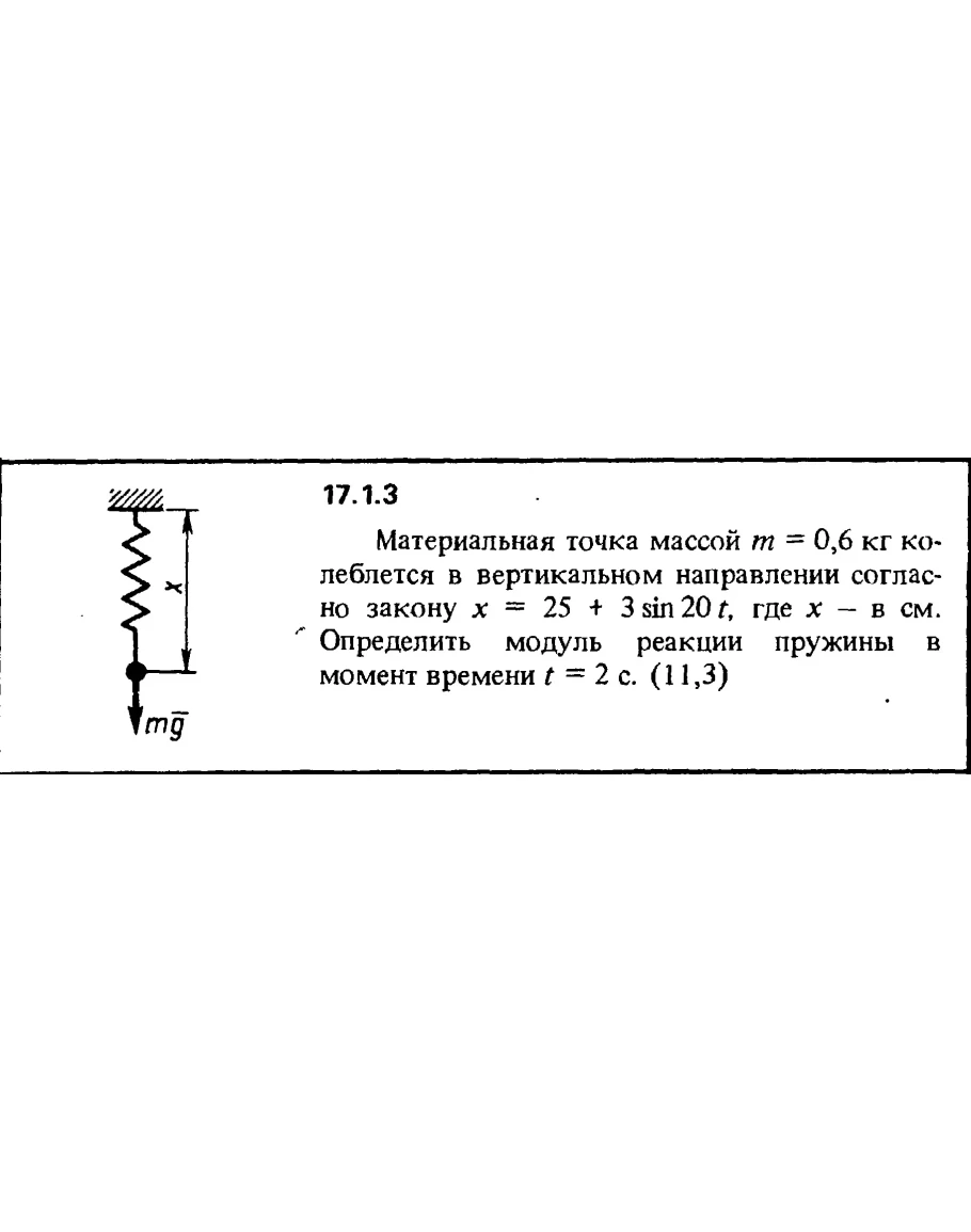 17.1.3. Материальная точка массой m = 0,6 кг колеблется в вертикальном направлении согласно закону х = 25 + 3sin20t, где х - в см. Определить модуль реакции пружины в момент времени t = 2 с.