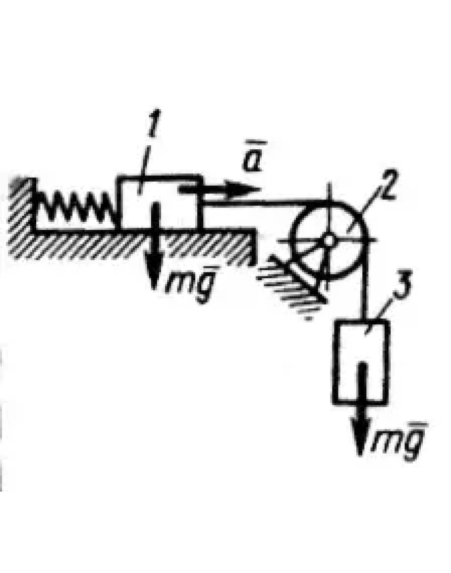 В рассматриваемый момент времени тела 1 и 3, массы которых одинаковы и равны m = 0,6 кг, движутся с ускорением а = 3 м/с2. Определить в этот момент времени модуль реакции шарнира блока 2. Массой блока 2 пренебречь. (Ответ 5,78)