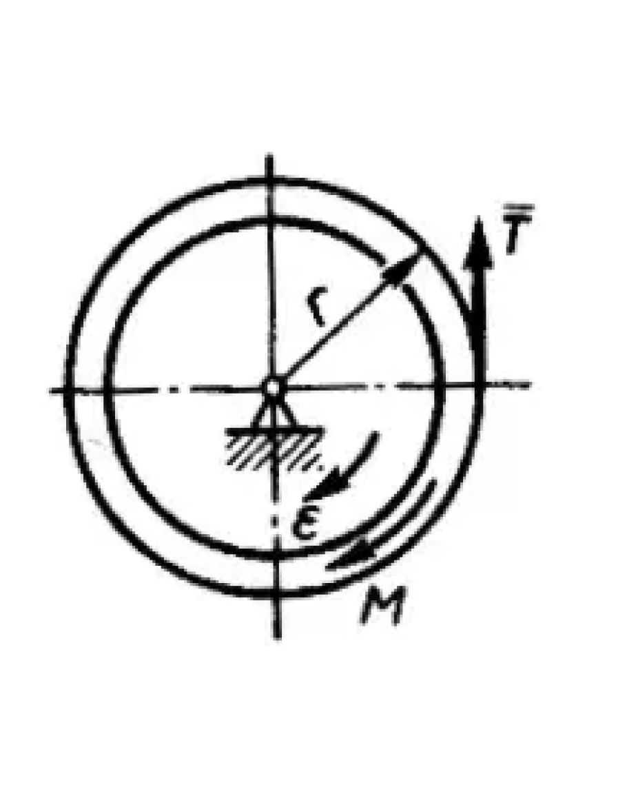 Колесо радиуса r = 0,2 м вращается с угловым ускорением ϵ = 20 рад/с2. На колесо действует пара сил с моментом М = 1,5 Н · м и сила Т. Момент инерции колеса относительно его оси вращения равен 0,05 кг · м2. Определить модуль силы Т. (Ответ 2,5)