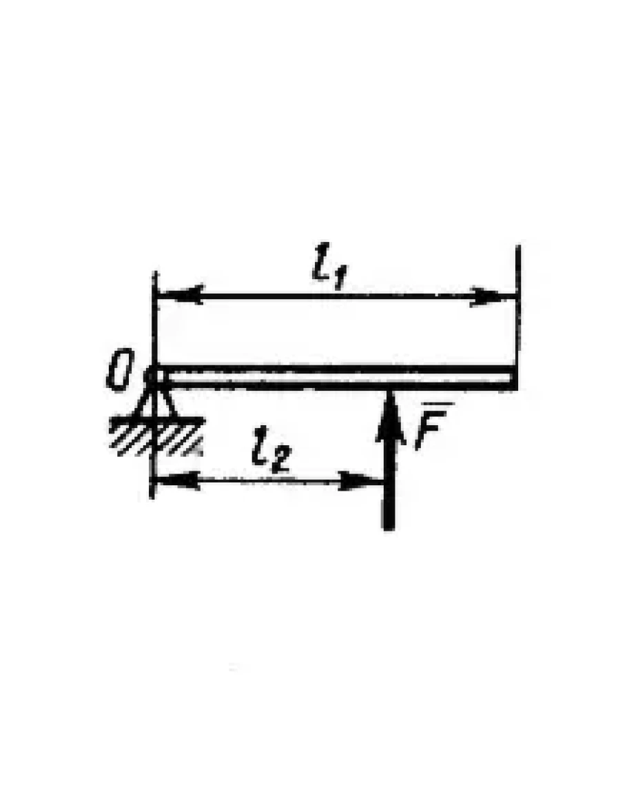 Однородный стержень длиной l1 = 1,5 м начинает вращаться в горизонтальной плоскости из состояния покоя под действием силы F. Определить, при каком расстоянии l2 в начальный момент движения реакция в шарнире О равна нулю? (Ответ 1)