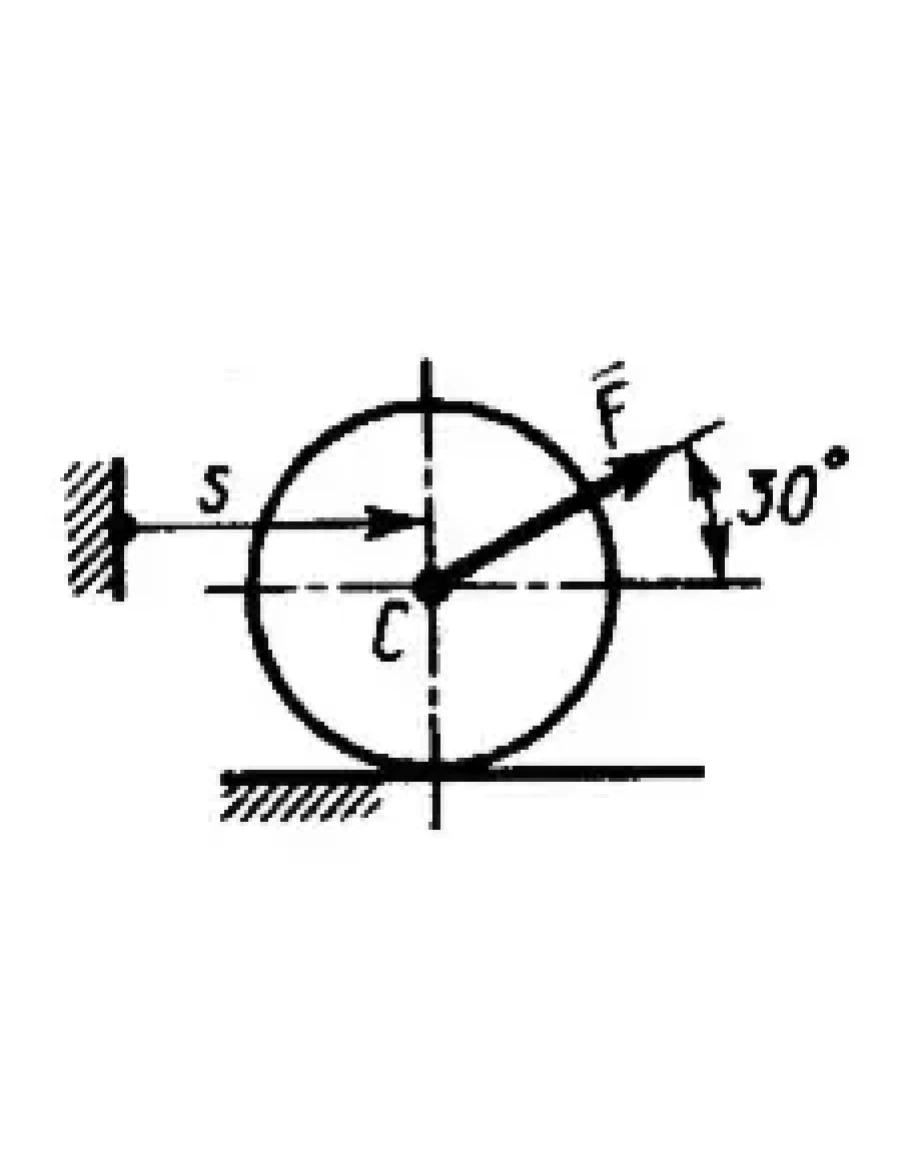 Однородный цилиндр массой 400 кг под действием силы F катится по горизонтальной плоскости. Центр масс С цилиндра движется согласно уравнению s = 0,5 t2. Определить модуль силы F. (Ответ 693)