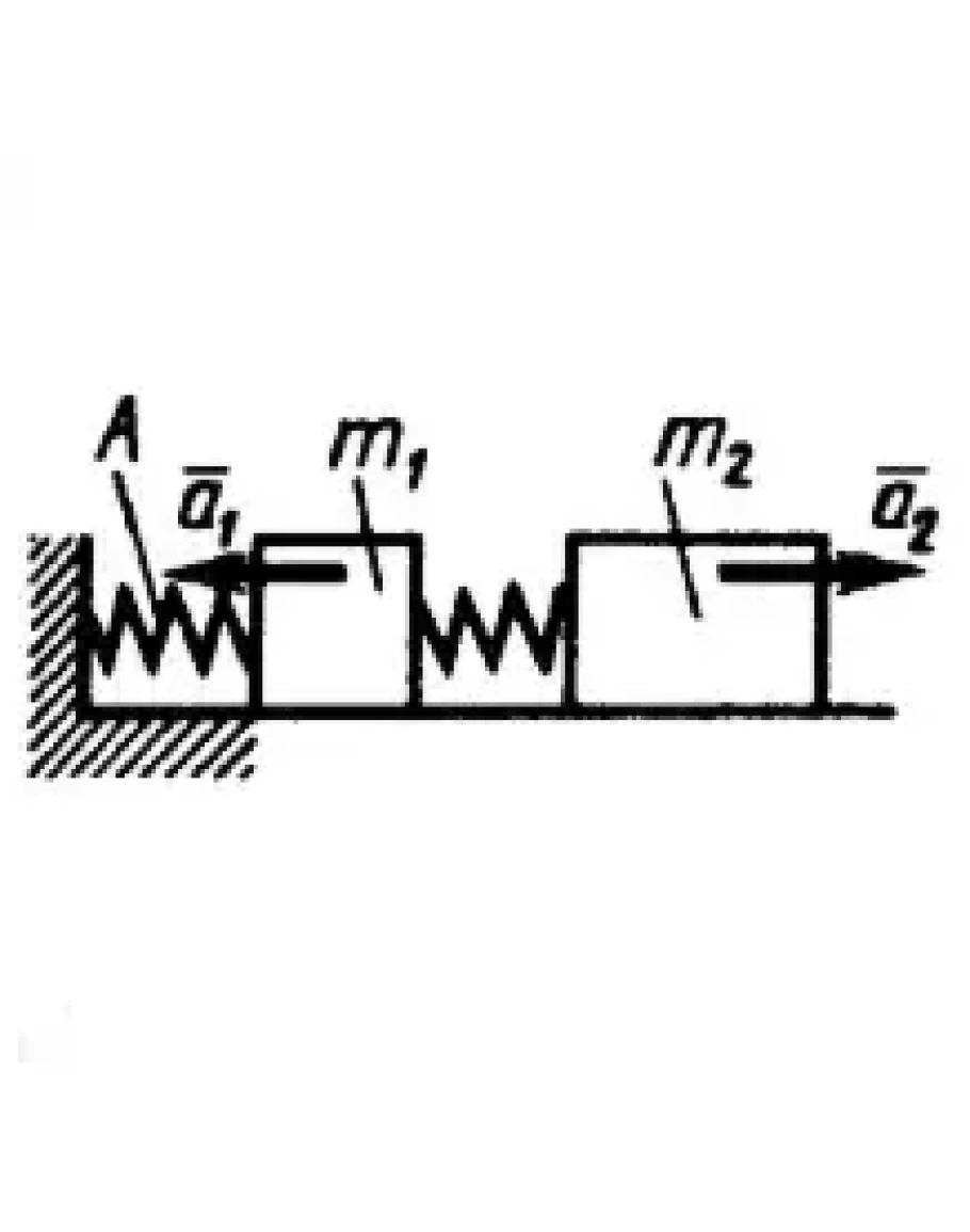 В процессе колебаний тела с массами m1 = 10 кг и m2 = 20 кг движутся по горизонтальной направляющей, имея в некоторый момент времени ускорения а1 = 20 м/с2 и а2 = 30 м/с2. Определить модуль усилия, развиваемого в этот момент пружиной А. (Ответ 400)