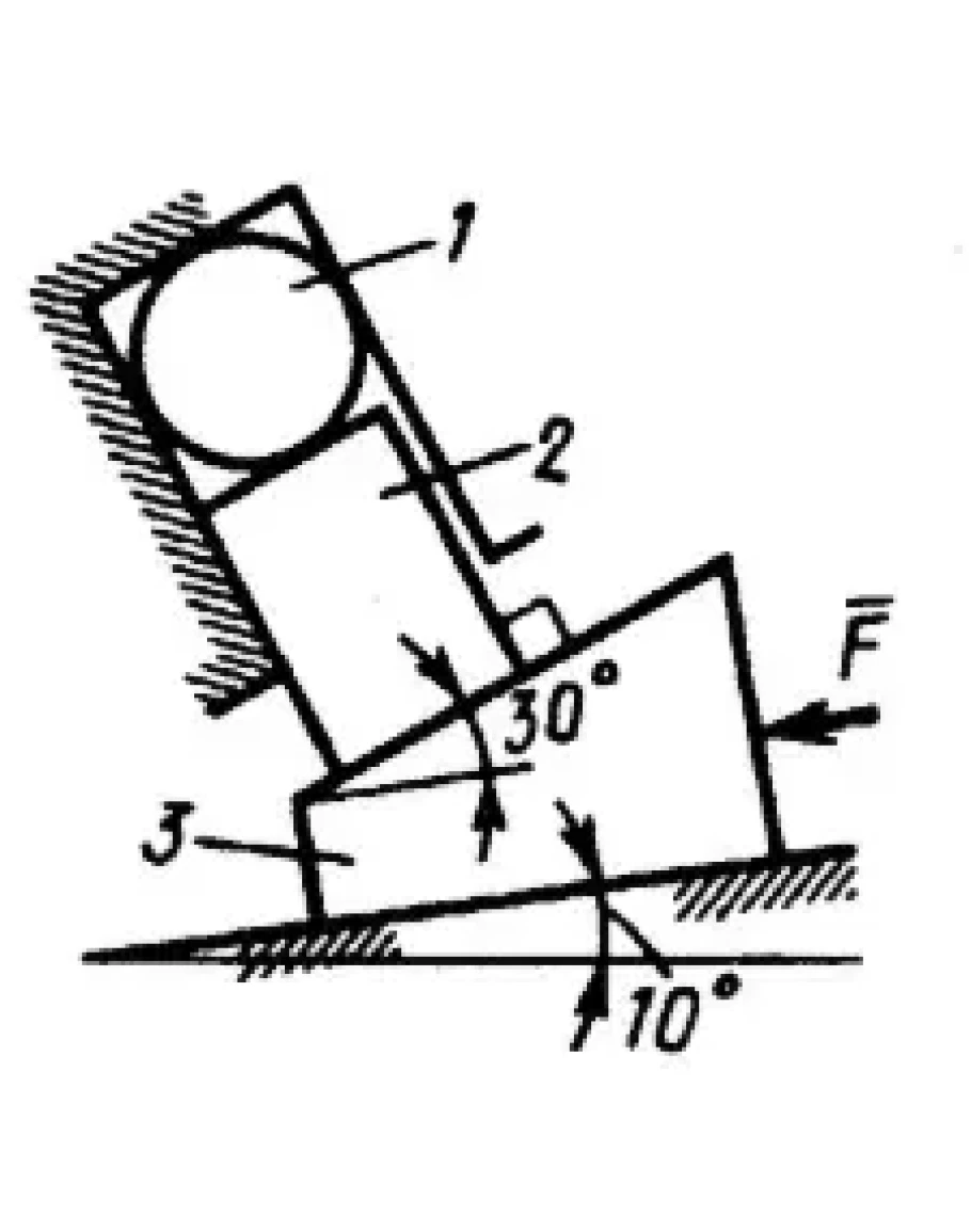 На тело 3 действует сила F = 460Н параллельно его плоскости опоры. Определить модуль силы давления тела 2 на сжимаемое тело 1 при равновесии системы. (Ответ 920)