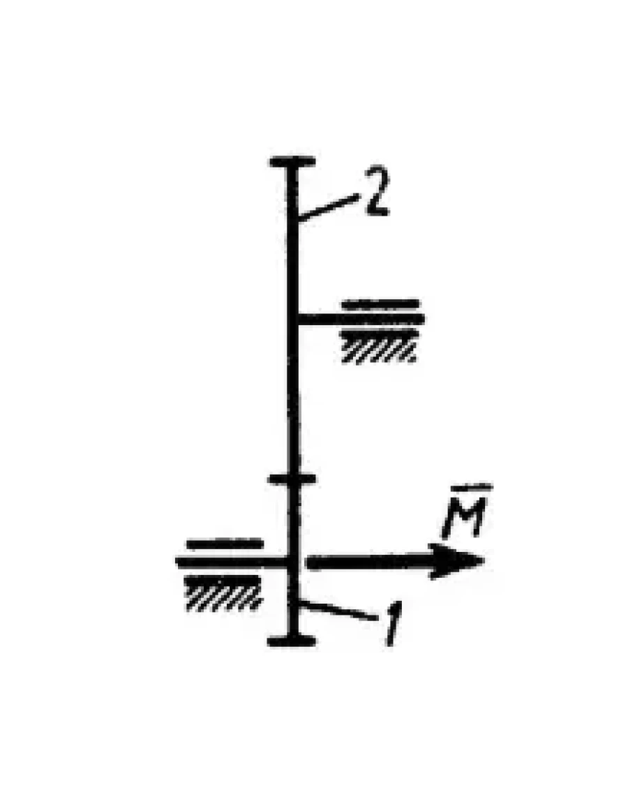 Определить угловое ускорение ϵ1 зубчатого колеса 1, если радиусы колес r1 = 0,1 м, r2 = 0,2 м, моменты инерции относительно осей вращения I1 = 0,02 кг • м2, I2 = 0,04 кг • м2, момент пары сил М = 0,3 Н • м. (Ответ 10)