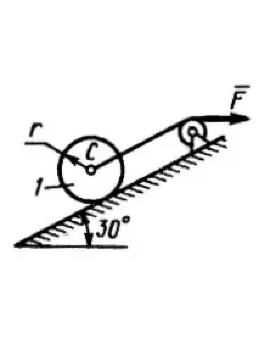 Определить модуль силы F, под действием которой центр С однородного сплошного катка 1, масса которого m1 = 20 кг, а радиус r = 0,4 м, движется вверх с постоянным ускорением aC = 1 м/с2. (Ответ 128)
