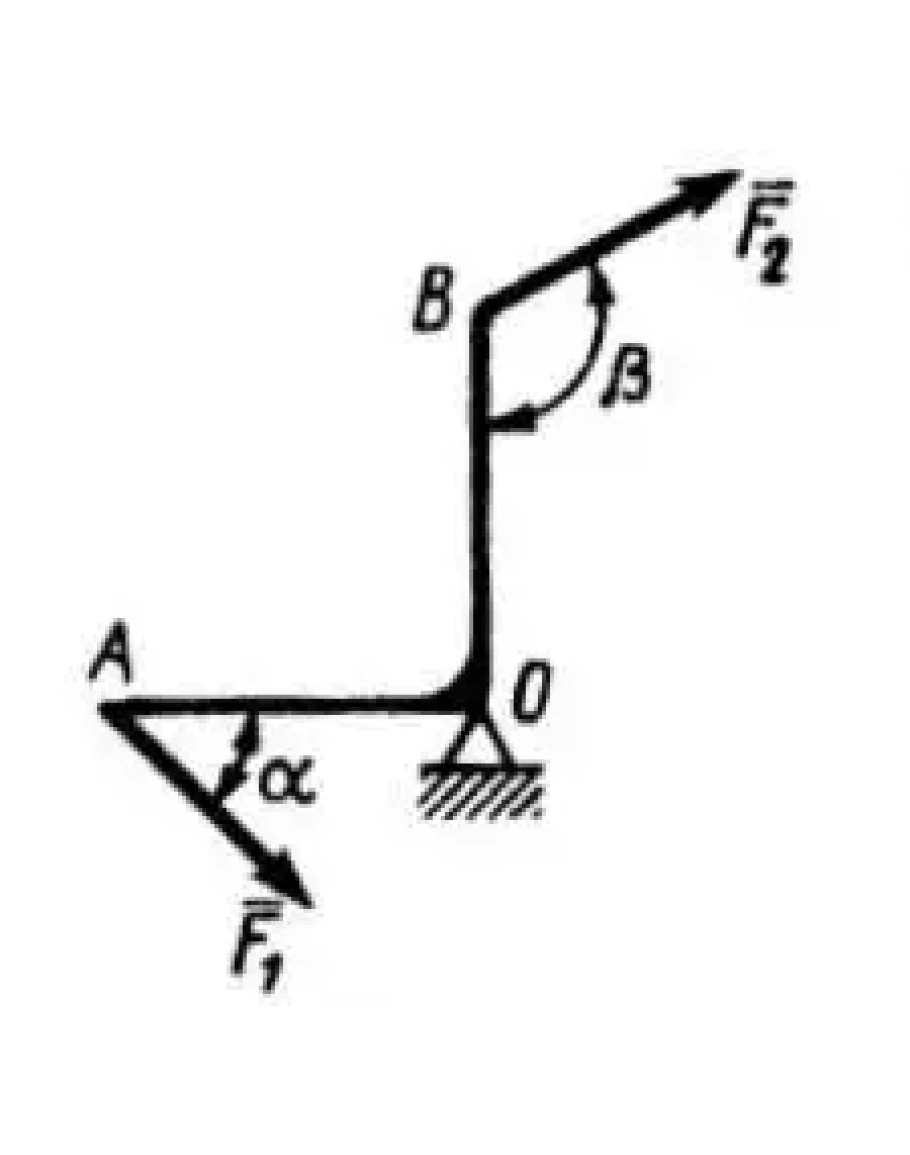 Определить модуль силы F2, необходимой для того, чтобы удержать рычаг в равновесии, если углы ?=45°, ?=120°, длины АО = 0,5 м, ВО = 0,6 м.