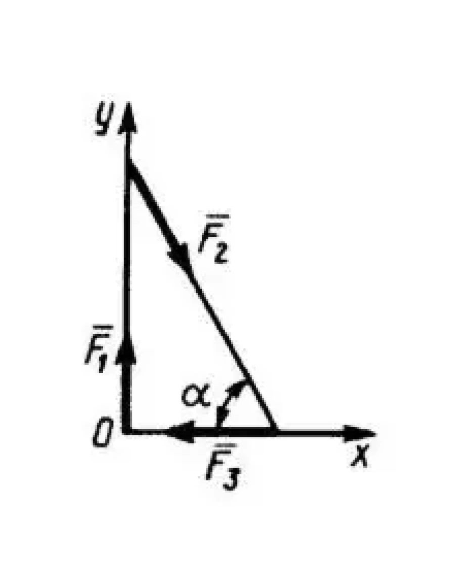 К вершинам прямоугольного треугольника приложены силы F1 = 12Н, F2 = 4Н, F3 = 2Н. Определить значение угла а в градусах, при котором главный вектор данной системы сил параллелен оси Оу. (Ответ 60,0)