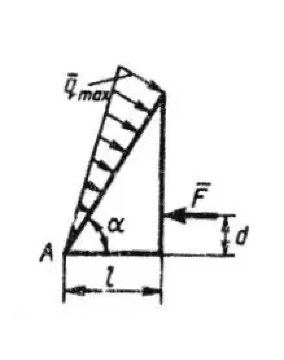 На каком расстоянии d нужно приложить силу F = 100Н, для того чтобы линия действия равнодействующей этой силы и распределенной нагрузки интенсивностью qmax = 3 Н/м прошла через точку А, если расстояние l = 10м, угол α=60°? (Ответ 4,0)