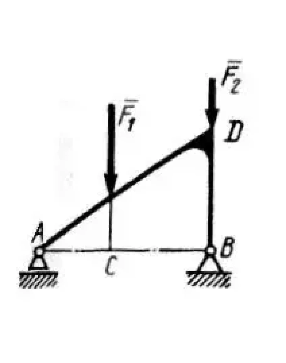 На раму ADB действуют вертикальные силы F1 = 9 кН и F2 = 4 кН. Определить в кН реакцию опоры В, если расстояния АС = 2,5 м, АВ = 6м. (Ответ 7,75)