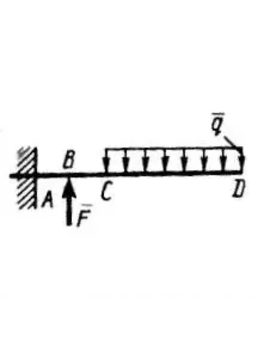Определить вертикальную силу F, при которой момент в заделке А равен 240 Н•м, если интенсивность распределенной нагрузки q = 40 Н/м, а размеры CD = 3 м, АВ = ВС = 1 м.(Ответ 180)