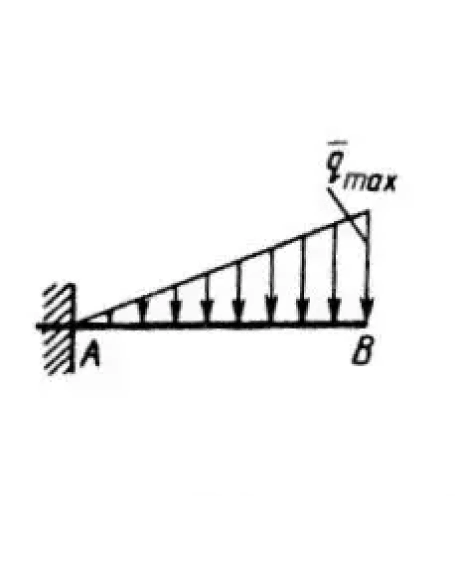 Определить момент в заделке А, если интенсивность распределенной нагрузки qmax = 100 Н/м, а длина бруса АВ равна 3 м. (Ответ 300)